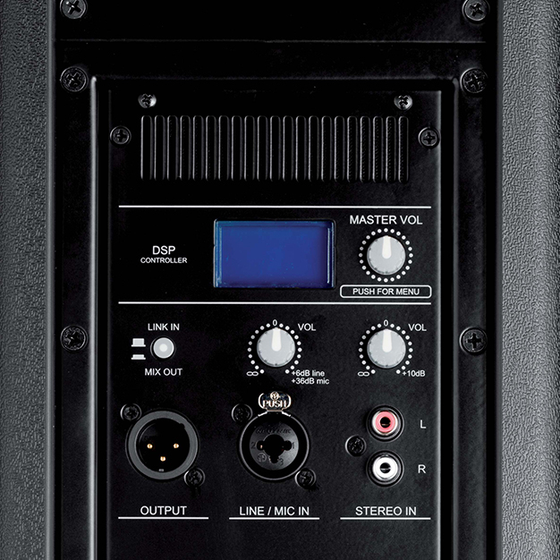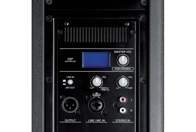 DSP: 6 presets, 2 κενά preset για προγραμματισμό απο τον χρήστη με 5 παραμέτρους το καθένα, high-pass filter, mic/line επιλογή, Ρυθμίσεις low, mid & high, προαιρετικό delay 0 - 3.5m, limiter modes Max SPL / Max Quality