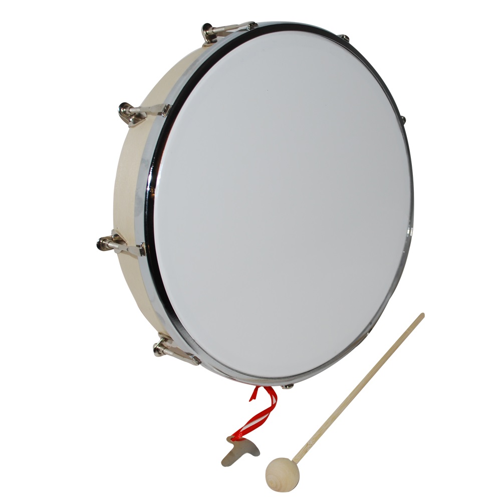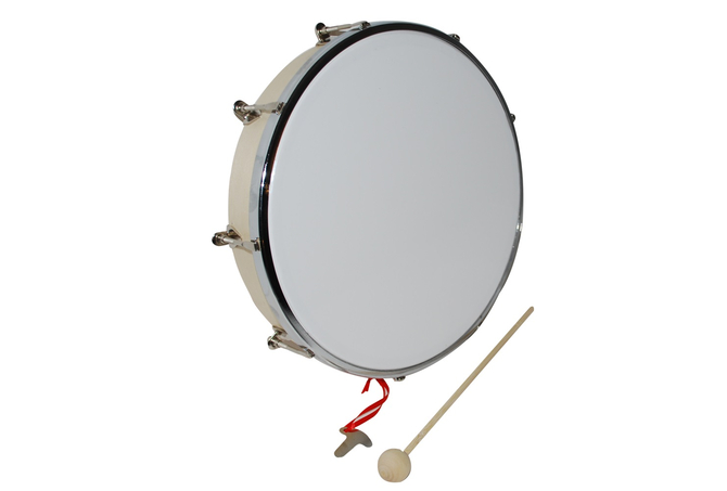 Ταμπουρίνο χορδιζόμενο, διαμέτρου 10" (25cm), ξύλινο στέλεχος, πλαστικό δέρμα. Περιλαμβάνεται ξύλινο κοπανάκι.
