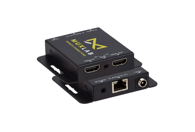 Muxlab HDMI Extender Kit 60m UHD-4K, κιτ επέκτασης με HDMI που υποστηρίζει ασυμπίεστο βίντεο με ανάλυση έως 4K/30 (4:4:4) μέσω μη θωρακισμένου καλωδίου συνεστραμμένου ζεύγους Cat6 σε αποστάσεις έως 40m σε 4K/30 και 60m σε 1080p.Είναι συμβατό με HDCP 1.4 και υποστηρίζει μια θύρα IR ενός δρόμου για απομακρυσμένο έλεγχο των τελικών συσκευών. Το κιτ περιλαμβάνει ένα πομπό και ένα δέκτη, καθώς και έναν πομπό IR και έναν αισθητήρα IR.