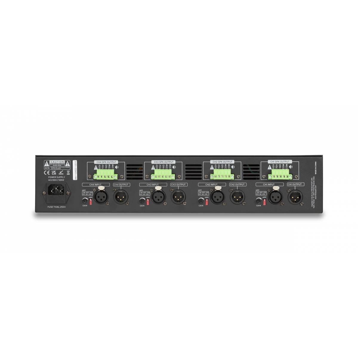 - Οι είσοδοι και έξοδοι είναι συμμετρικές με συνδέσεις XLR, ενώ όλες οι έξοδοι ισχύος διαθέτουν συνδέσεις Phoenix (Europlug).