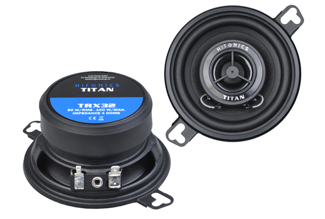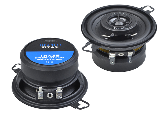 TITAN coaxial speakers with powerful sound have a very long tradition in the HiFonics loudspeaker range. The very good sound quality and durability, which also astonishes with an excellent price-performance ratio, have always been particularly valued. But standing still is not an option in the world of sound technology either. That is why the HiFonics developers have given the models a complete makeover and combined them with innovative materials. The result is a sound that not only retains the audiophile charm of the Titan loudspeakers, but surpasses it in many details. The newly used composite membranes made of a MICA/paper mixture, which have proven to be superior in terms of sound to the previous membranes in many listening tests, make a significant contribution to improving the sound of the new TITAN TRX loudspeakers. Thanks to the ultra-light, very stable and excellently dampening MICA membrane composition, bass and mid frequencies are always reproduced precisely and powerfully and distortion is minimized. The sound always remains neutral, clear and balanced. This means that every piece of music is reproduced in its full detail and dynamics. Specifications 8,7 cm (3.5″) 2-Way Coaxial Speakers 50 W/RMS, 100 W/MAX, 4 Ω Frequency Range 90 – 22000 Hz 13 mm Mylar Neodymium Tweeters Ø 80 mm, ‡ 43 mm Downloads Owner’s Manual