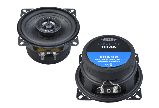 TITAN coaxial speakers with powerful sound have a very long tradition in the HiFonics loudspeaker range. The very good sound quality and durability, which also astonishes with an excellent price-performance ratio, have always been particularly valued. But standing still is not an option in the world of sound technology either. That is why the HiFonics developers have given the models a complete makeover and combined them with innovative materials. The result is a sound that not only retains the audiophile charm of the Titan loudspeakers, but surpasses it in many details. The newly used composite membranes made of a MICA/paper mixture, which have proven to be superior in terms of sound to the previous membranes in many listening tests, make a significant contribution to improving the sound of the new TITAN TRX loudspeakers. Thanks to the ultra-light, very stable and excellently dampening MICA membrane composition, bass and mid frequencies are always reproduced precisely and powerfully and distortion is minimized. The sound always remains neutral, clear and balanced. This means that every piece of music is reproduced in its full detail and dynamics. Specifications 10 cm (4″) 2-Way Coaxial Speakers 60 W/RMS, 120 W/MAX, 4 Ω Frequency Range 70 – 22000 Hz 13 mm Mylar Neodymium Tweeters Protection Grille Ø 96 mm, ‡ 48 mm Downloads Owner’s Manual