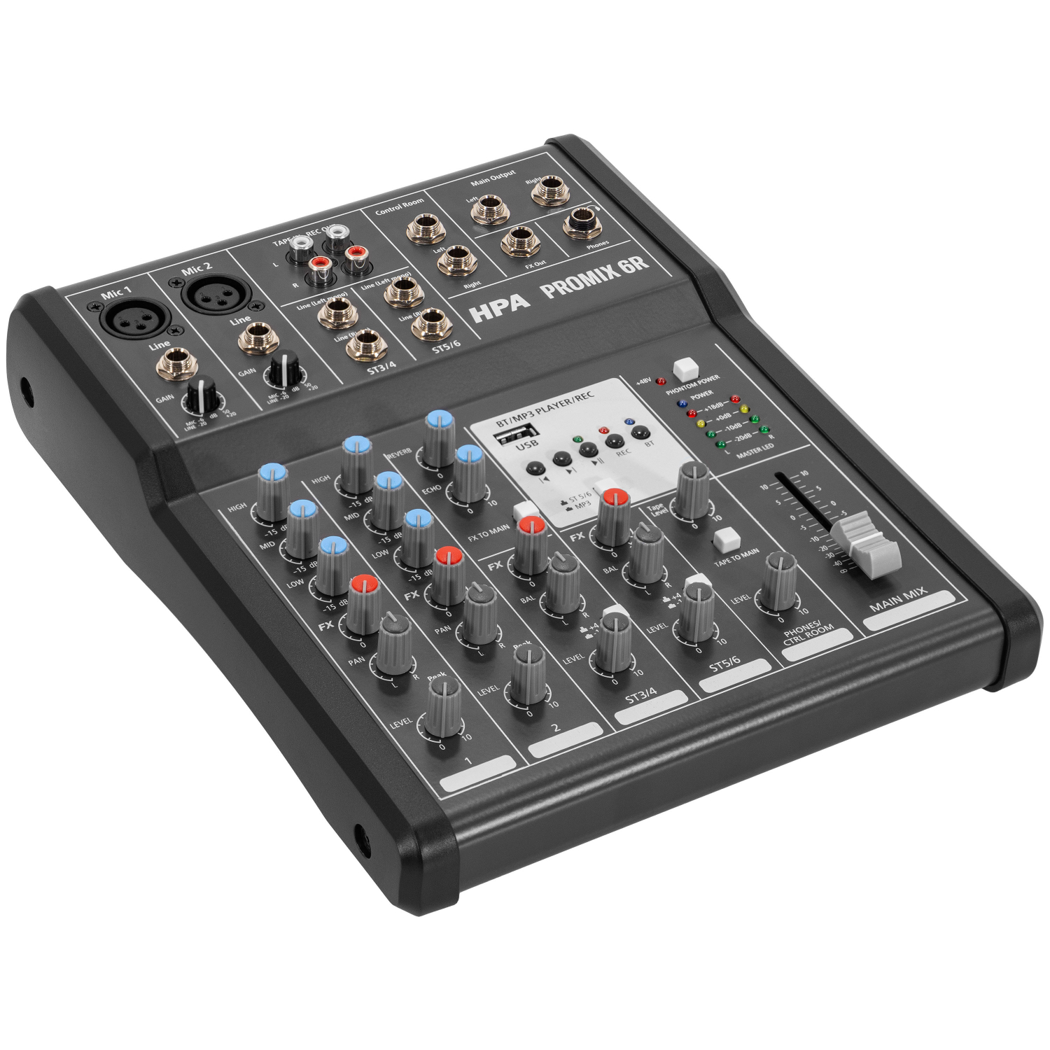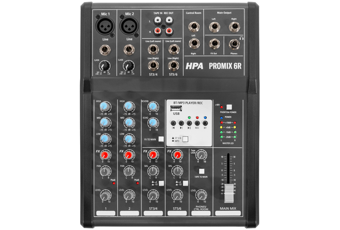 Η HPA Promix 6R είναι μια συμπαγής και ευέλικτη αναλογική κονσόλα μίξης, σχεδιασμένη για μικρές εγκαταστάσεις και χρήστες που χρειάζονται απλή, αλλά πλήρως λειτουργική λύση για live εμφανίσεις, στούντιο ή home studios.
