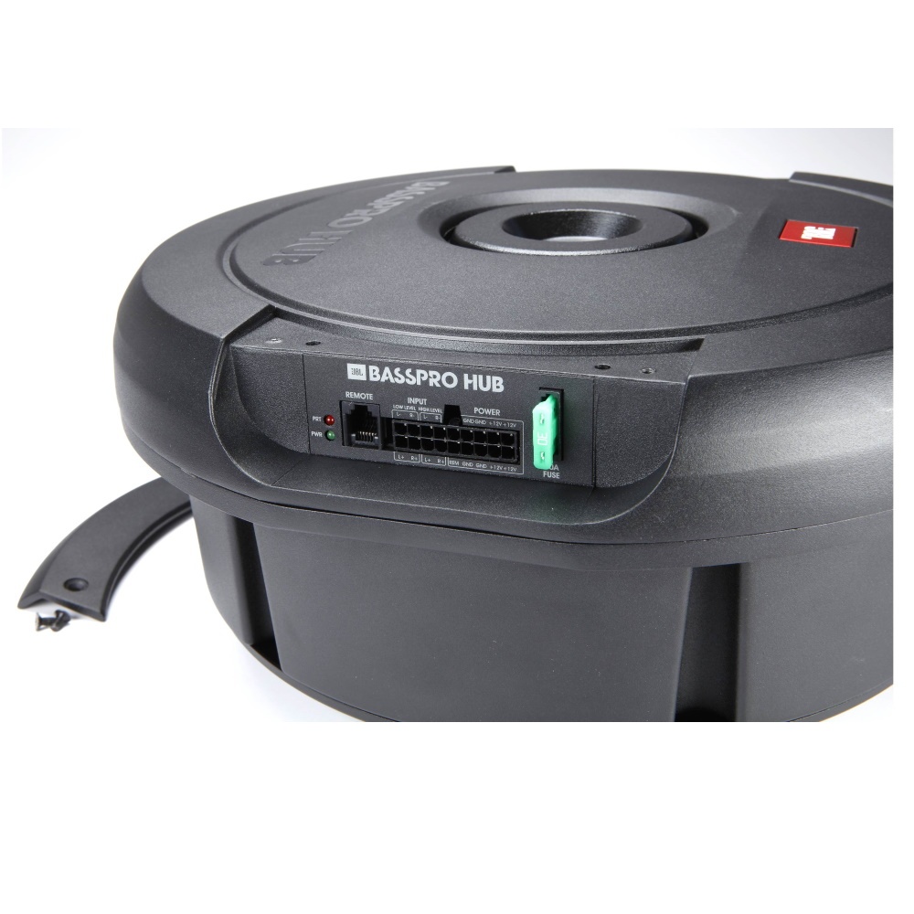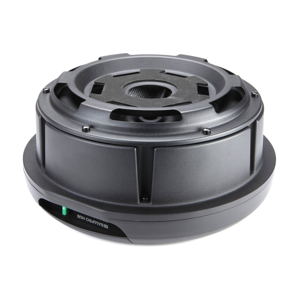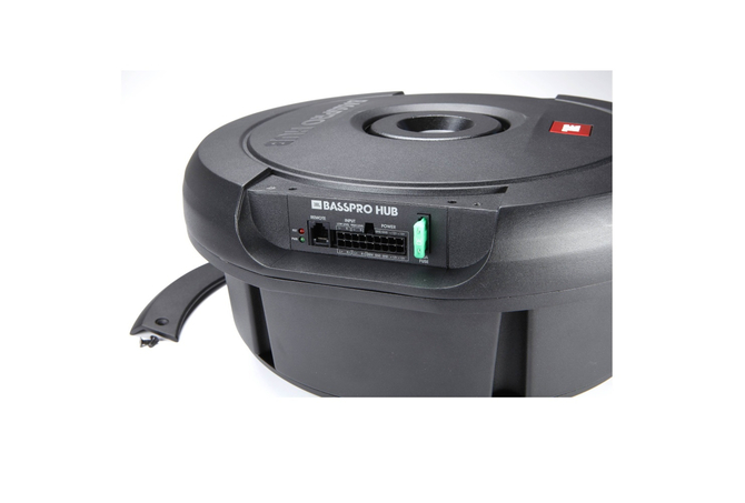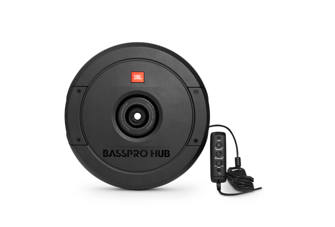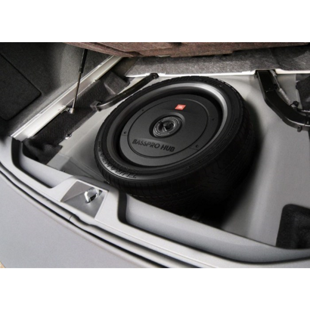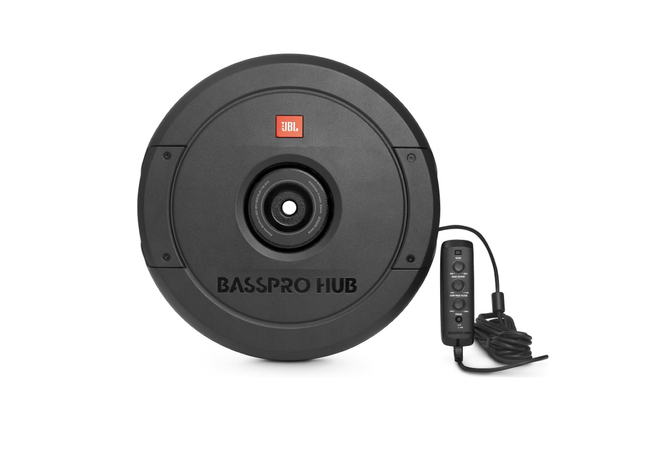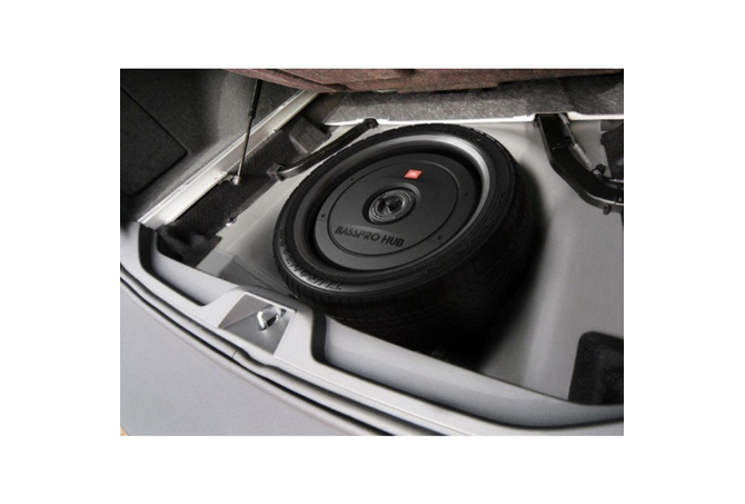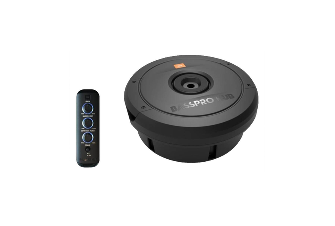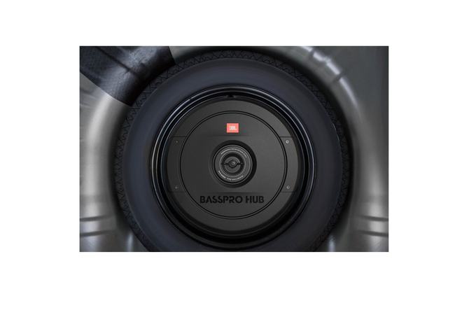 JBL’s Bass Pro Hub Subwoofer Rattles Your Rear View Mirror.The new JBL Bass Pro Hub subwoofer delivers show & shine performance without crowding your passengers or sacrificing cargo area. This all-in-one powered subwoofer system fits into the hub of your spare tire for a super easy installation and out of sight sound solution. The built-in Class D amplifier delivers 200W RMS and is designed to work with the Bass Pro Hub subwoofer and enclosure as a system. The 11″ (279mm) feather-light fiberglass woofer cone with rubber surround delivers the signature kick and punch of JBL bass. And with over temperature protection (OTP) and over current protection (OCP) you can count on reliability at peak volume levels. The included remote control enables adjustment of crossover point, gain, phase—and a bass boost of 12dB when you’re in the mood and on the move. Whether you’re cruising or competing, the JBL Bass Pro leaves the competition behind without missing a beat.