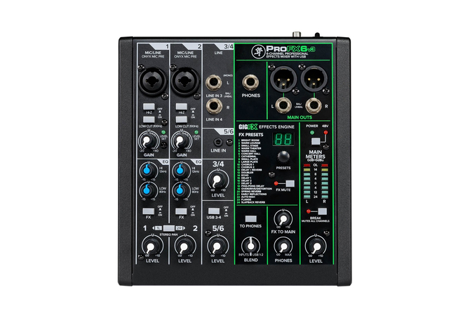 Mackie ProFX6v3, αναλογική κονσόλα ήχου 6 καναλιών για επαγγελματική ή οικιακή χρήση που διαθέτει FX και θύρα USB για ηχογράφηση μέσω υπολογιστή, ιδανική για μουσικούς και δημιουργούς περιεχομένου.Διαθέτει δύο προ-ενισχύσεις Onyx που φτάνουν τα 60dB gain και προσφέρει δυνατότητα ηχογραφήσεων σε υψηλές αναλύσεις μέχρι 192κΗΖ. Έρχεται με 24 προ-εγκαταστημένα FX, δύο εισόδους μικροφώνων, 4 εισόδους line, EQ 2 ζωνών στα κανάλια 1-2, 48V phantom power, διπλή στερεοφωνική επιστροφή μέσω USB και δυνατότητα επιλογής των εισόδων σε λειτουργία Hi-Z για την σύνδεση οργάνων.