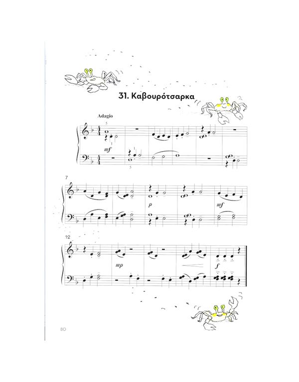 την πρώτη επαφή με τη γραφική παρτιτούρα και τον τρόπο ανάγνωσής της και την ώθηση σε καθοδηγούμενο αυτοσχεδιασμό ή που απλώς ψάχνουν αφορμές για συνεργασία μεταξύ των παιδιών με κομμάτια που μπορούν να παιχτούν και με 4 ή 6 χέρια.