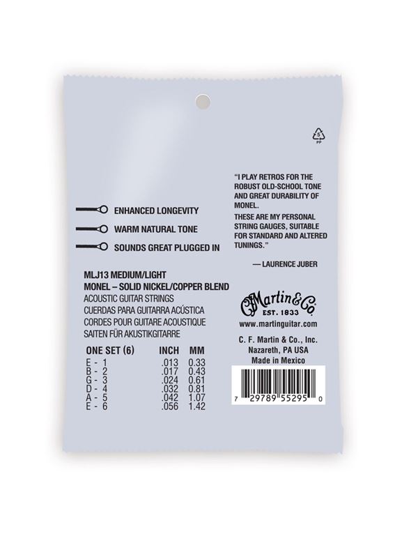 Με τις χορδές Martin Retro®, έχετε ένα δυνατό σετ που προσφέρει αληθινό, σταθερό τόνο και δεν μοιάζει με τίποτα άλλο στην αγορά. Το συμπαγές μείγμα νικελίου/χαλκού της Martin παρέχει μια μειωμένη επίθεση από την πέννα με αποτέλεσμα να ακούγονται τα ξύλα της κιθάρας χωρίς να επισκιάζονται. Το ιδιόκτητο σύρμα περιτυλίγματος Monel της Martin είναι φυσικά ανθεκτικό στη διάβρωση, ώστε να μπορείτε να τα παίζετε για μεγάλο χρονικό διάστημα και να διατηρείται ο τόνος σας. Ανακαλύψτε την αληθινή φωνή της κιθάρας σας. Οι χορδές Retro® προσφέρουν βελτιωμένη μακροζωία με ζεστό φυσικό τόνο και ακούγονται υπέροχα στο ρεύμα.