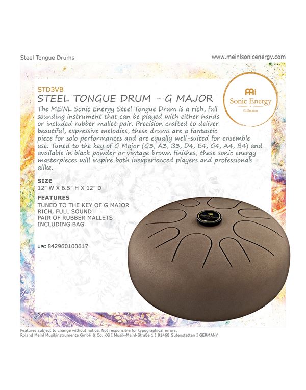 Steel Tongue Drum MEINL Sonic Energy STD3VB με πλούσιο ήχο και φινίρισμα Vintage Brown. Μπορεί να παιχτεί είτε με τα δύο χέρια είτε mallets από καουτσούκ σφύρα. Kατασκευασμένο με ακρίβεια προσφέρει όμορφες, εκφραστικές μελωδίες και είναι ιδανικό για σόλο παραστάσεις και αλλά και για χρήση σε σύνολο.