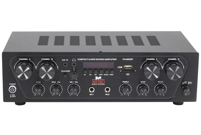PA-480BT, επαγγελματικός ενισχυτής για εγκαταστάσεις, 4 καναλιών ισχύος 50W / 4Ω/ch. Κάθε κανάλι εξόδου διαθέτει binding post για τη σύνδεση δύο ηχείων (παράλληλα). 4 ρυθμιστικά έντασης (ένα για κάθε κανάλι), ενσωματωμένο ραδιόφωνο, media player με θύρες USB/SD για αναπαραγωγή MP3 , λειτουργία Echo, 2 εισόδους μικροφώνου, ρύθμιση bass – treble, λειτουργία talk over και Bluetooth για stream από φορητές συσκευές.