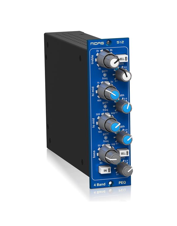 The PARAMETRIC EQUALISER 512 is a compact 500 Series 4 band fully parametric equaliser based on channel strip originally provided in the legendary Midas HERITAGE 3000 mixing console. When used in conjunction with the LEGEND L10, L6, or other standard 500 Series rackmount chassis, the 512 provides the ideal EQ solution for users seeking Midas performance in a modular format that boasts upgraded, premium-quality performance.