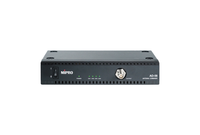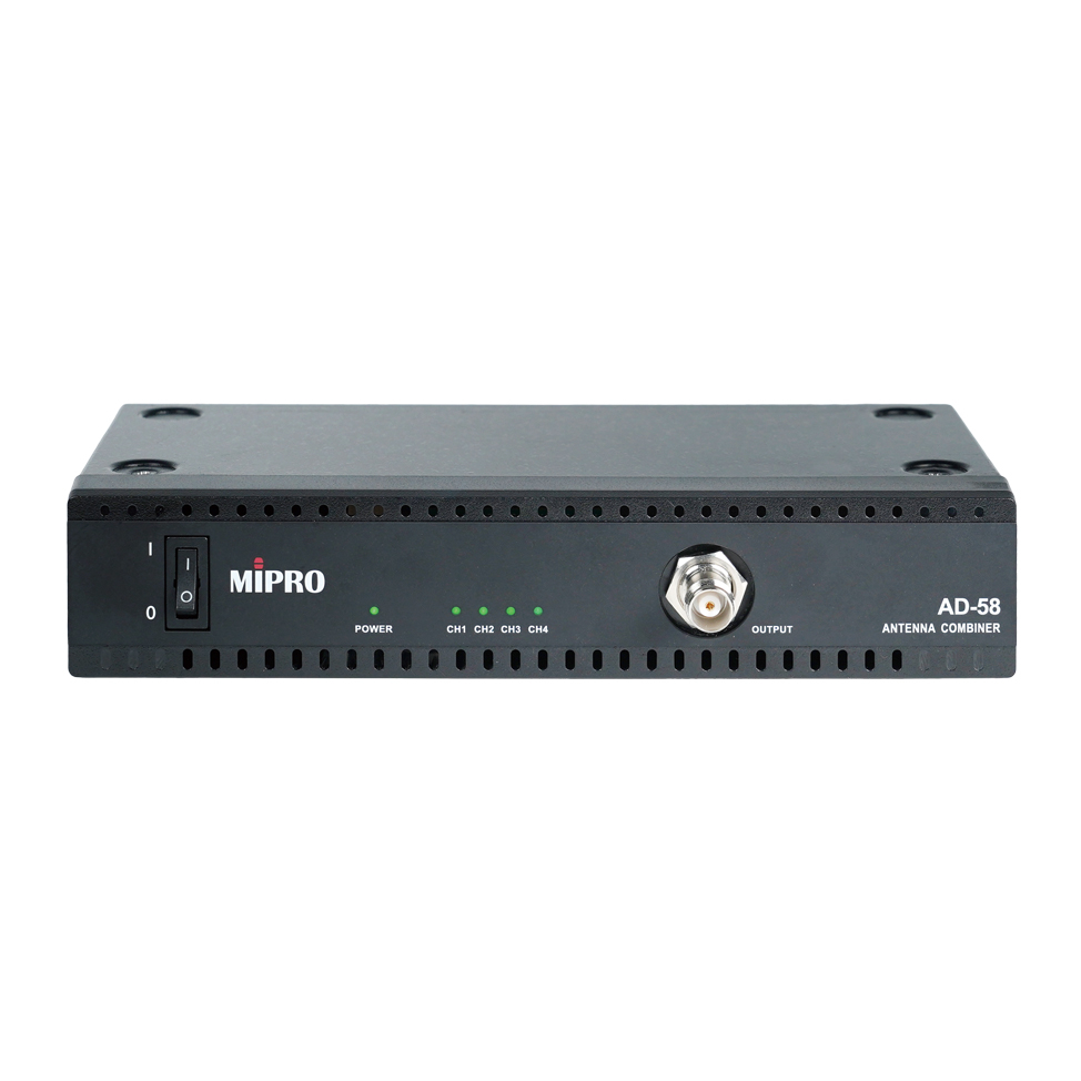Το MIPRO AD-58 είναι ένας Active Antenna Combiner 4 καναλιών στα 5 GHz, σχεδιασμένος για να συνδυάζει τα σήματα έως και τεσσάρων πομπών MI-58T ή MI-58TD σε μία μόνο κεραία. Αυτό το καθιστά ιδανικό για επαγγελματικά συστήματα In-Ear Monitoring (IEM), όπου απαιτείται σταθερή και καθαρή μετάδοση σε πολλαπλά κανάλια.