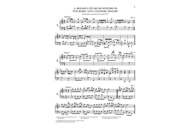 Aυτός ο τόμος περιέχει όλα τα ολοκληρωμένα κομμάτια για πιάνο - εκτός από τις σοντάτες και τις παραλλαγές - του Mozart. Eπίσης περιέχουν μερικά μουσικά κομμάτια που ολοκληρώθηκαν από μουσικούς του στενού κύκλου του Mozart.