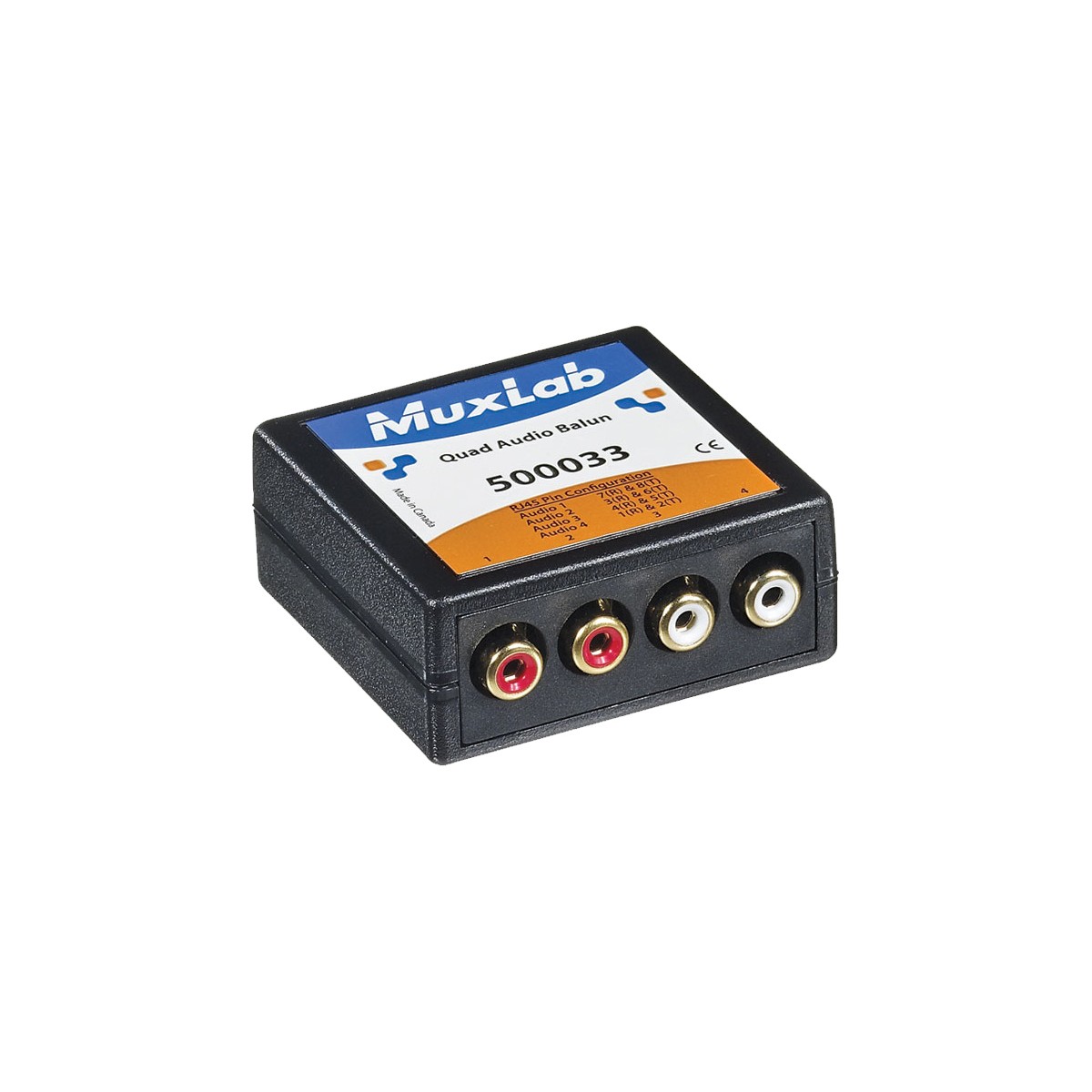Quad Audio Balun 500033, RCA, επιτρέπει τη μεταφορά έως τεσσάρων ανεξάρτητων σημάτων Line ή δύο στερεοφωνικά RCA μέσω ενός και μόνο καλωδίου Cat5e/6, σε αποστάσεις έως 1 χιλιόμετρο σε σύνδεση point-to-point. Χρησιμοποιείται σε ζεύγος εξαλείφοντας την ανάγκη για πολλάπλά ομοαξονικά καλώδια. Είναι συμαβατό με το Muxlab 500033-WP-US (DecoraT) και το 500033-WP-UK που τοποθετούνται στον τοίχο αλλά και με τα Audio Baluns 500019 (μονό RCA) ή 500028 (διπλό RCA).Τεχνικά χαρακτηριστικάΕπέκταση σημάτων Hi-Fi διπλού στερεοφωνικού ήχου έως και 1km μέσω καλωδίου Cat5e/6Απόκριση συχνότητας: 20Hz έως 20kHz (σε όλο το εύρος απόστασης)Υποδοχές RCA με χρωματική κωδικοποίηση (θηλυκού τύπου)Διαστάσεις: 61 x 57 x 25mmΒάρος: 0,103kgΣυμβατό με: 500019, 500028/F/WP-US/WP-UK, 500033-WP-US/WP-UK