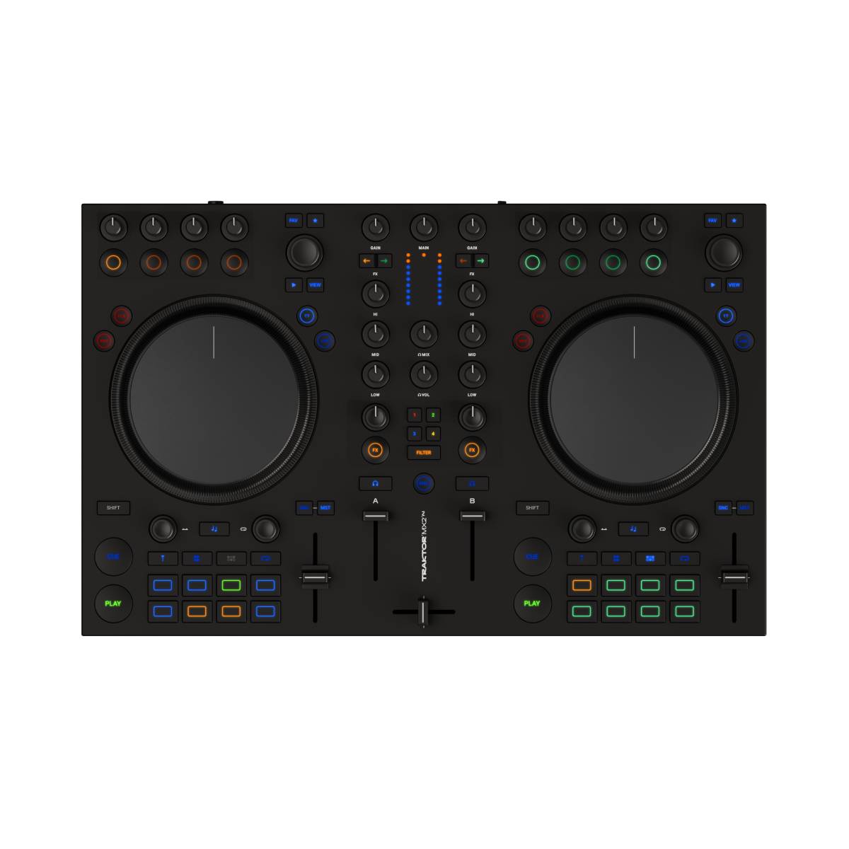 Το Traktor MX2 είναι ένας DJ controller 2 καναλιών νέας γενιάς, σχεδιασμένος για ανερχόμενους DJs που θέλουν επαγγελματικές λειτουργίες σε φορητή μορφή. Περιλαμβάνει την πλήρη έκδοση του λογισμικού Traktor Pro 4, προσφέροντάς σας άμεσο έλεγχο του beatmatching, του looping, των εφέ και του stem separation.