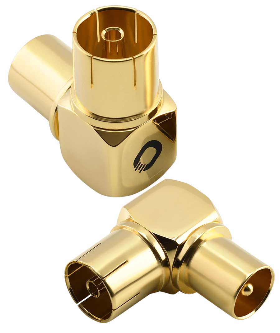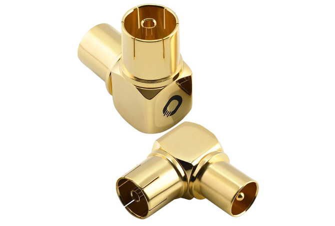 Στιβαρός σύνδεσμος γωνίας 90° για καλώδια κεραίας, βύσματα / συνδέσμους, επιχρυσωμένος 24 καρατίων.