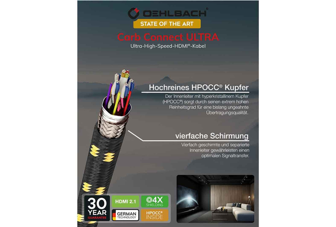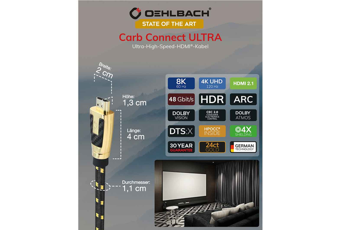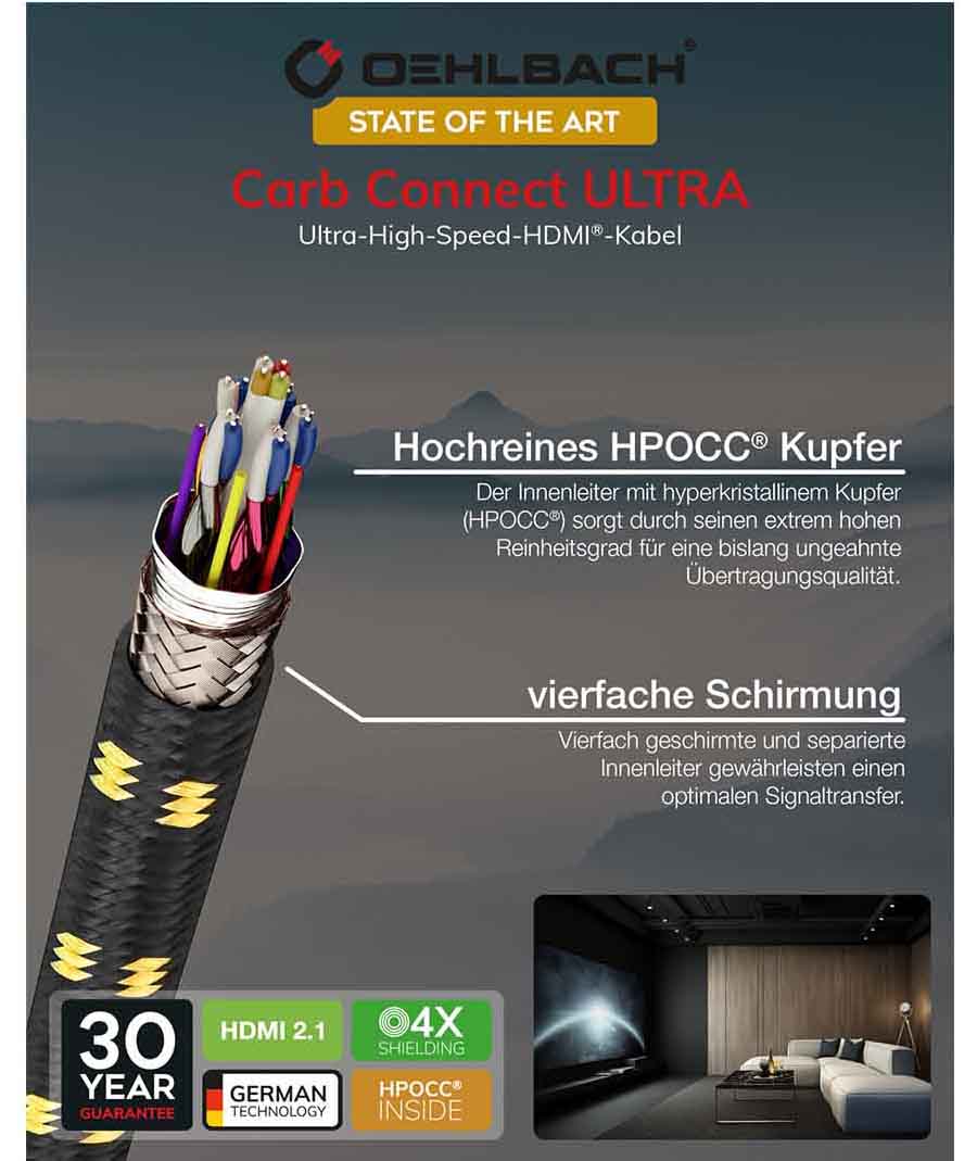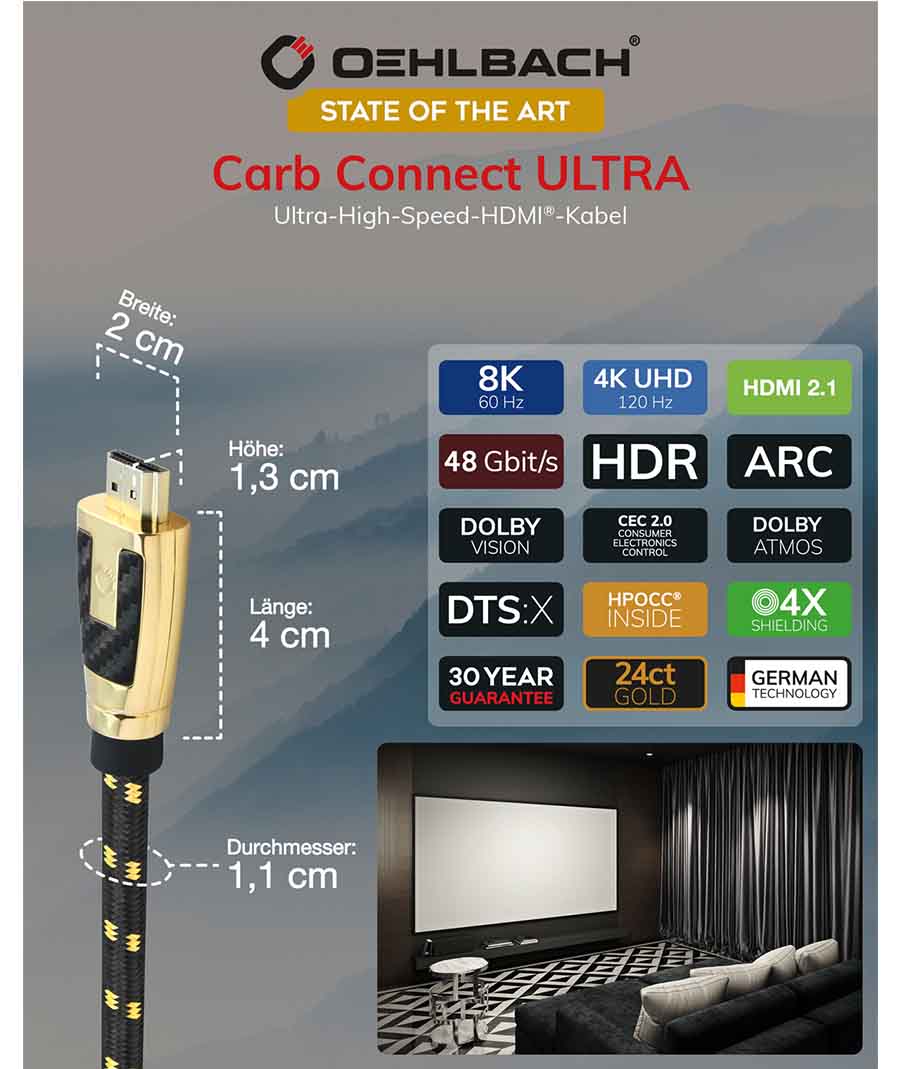 Το Carb Connect Ultra είναι ο διάδοχος του θρυλικού μας Carb Connect MKII. Το καλώδιο Ultra High-Speed HDMI® προσφέρει εκπληκτική ποιότητα σε 8K στα 50/60 Hz ή 4K έως 120 Hz. Ο πρωτοποριακός εσωτερικός αγωγός με υπερκρυσταλλικό χαλκό (HPOCC) εξασφαλίζει μια άνευ προηγουμένου ποιότητα μετάδοσης χάρη στον εξαιρετικά υψηλό βαθμό καθαρότητάς του. Οι τετραπλοί και διαχωρισμένοι εσωτερικοί αγωγοί εξασφαλίζουν βέλτιστη μεταφορά σήματος ακόμη και σε αναλύσεις έως 8K στα 60 Hz, 4K έως 120 Hz και συμβατές προς τα κάτω με Full HD. Οι επιχρυσωμένες επαφές βυσμάτων 24 καρατίων συνδέουν αυτόν τον αγωγό υψηλής ποιότητας σχεδόν χωρίς απώλειες με τις συσκευές οικιακής ψυχαγωγίας σας, όπως έξυπνες τηλεοράσεις, προβολείς υψηλής τεχνολογίας, κονσόλες παιχνιδιών τελευταίας γενιάς και πολλά άλλα. Η ανθεκτική, υφασμάτινη επένδυση και τα συμπαγή πλήρως μεταλλικά βύσματα με ένθετα άνθρακα υπογραμμίζουν την εξαιρετική ποιότητα αυτού του προϊόντος αιχμής.