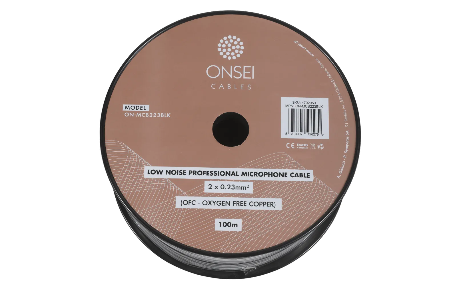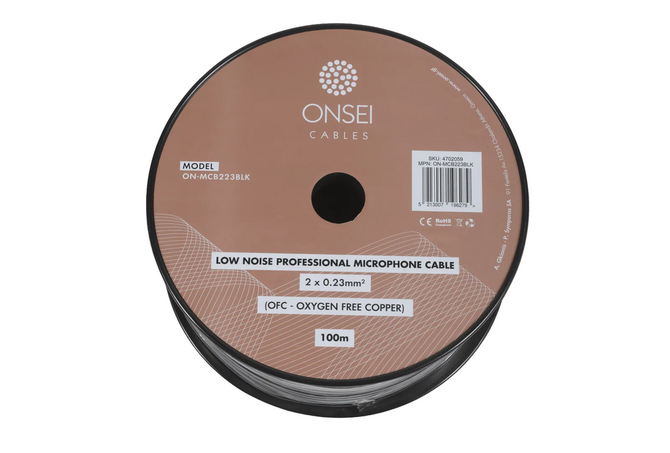 Onsei ON-MCB223BLK - Επαγγελματικό balanced καλώδιο μικροφώνου χαμηλού θορύβου, υψηλής ποιότητας σε μαύρο χρώμα. Το καλώδιο διαθέτει αγωγούς επενδυμένους με PVC και θωράκιση για την αποφυγή παρεμβολών. Εξωτ. διάμετρος καλωδίου O.D 6.0mm, εσωτερική διατομή 2 x 0.23mm2. Διατίθεται και σε κουλούρα των 100 μέτρων Conductor Drainsmm: OFC 20x0.12Conductor Insulation: PE red+white, 1.5mmFiller Materials: -Nominal Impedance: 110Ω1st Shield: 2x Conductive PVC2nd Shield: OFC Twisted 64x0.12 SpiralOut Jacket: BlackConductor Resistance: 90Ω/ kmShield Resistance: 25Ω/ kmCapacity Inner Conductor: 60pf/mWorking Temperature Min/Max: -20/+70*η τιμή αφορά το μέτρο.