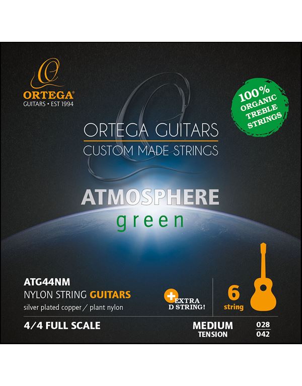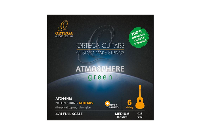 Οι χορδές Ortega Guitars Atmosphere Green δημιουργούνται και κατασκευάζονται στην Ιταλία. Αντικαθιστώντας τις χορδές πρίμων που συνήθως βασίζονται σε λάδι με ένα πρόσφατα αναπτυγμένο υλικό από νάιλον που είναι κατασκευασμένο από 100% φυτικά προϊόντα – η Ortega Guitars θέτει το ορόσημο για ένα φιλικό προς το περιβάλλον μέλλον στην παραγωγή χορδών κιθάρας. Κατά τη διαδικασία παραγωγής, οι εκπομπές άνθρακα μειώνονται περισσότερο από 50%. Η μικρή αλλά σημαντική συνεισφορά μας σε έναν πιο καθαρό και πιο πράσινο πλανήτη. Το πρόσφατα αναπτυγμένο υλικό μας προσφέρει έναν τέλειο συνδυασμό φωτεινού, ζεστού, διάχυτου τόνου και απίστευτης προβολής, ακριβούς τονισμού και σταθερού κουρδίσματος μεγάλης διάρκειας για πρόσθετη άνεση και playability.