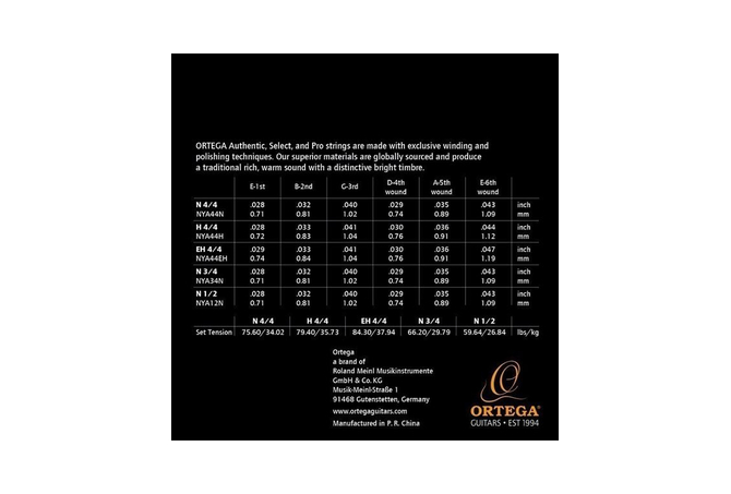 Οι χορδές ORTEGA Authentic, Select και Pro κατασκευάζονται με αποκλειστικές τεχνικές περιέλιξης και γυαλίσματος. Τα ανώτερα υλικά παγκόσμιας προέλευσης παράγουν έναν παραδοσιακό πλούσιο, ζεστό ήχο με μια χαρακτηριστική φωτεινή χροιά. Η αντισκωριακή επίστρωση στα σετ Pro και Select αποτρέπει την φθορά και διατηρεί τον καθαρό ήχο των νέων χορδών.
