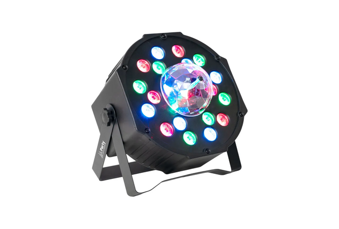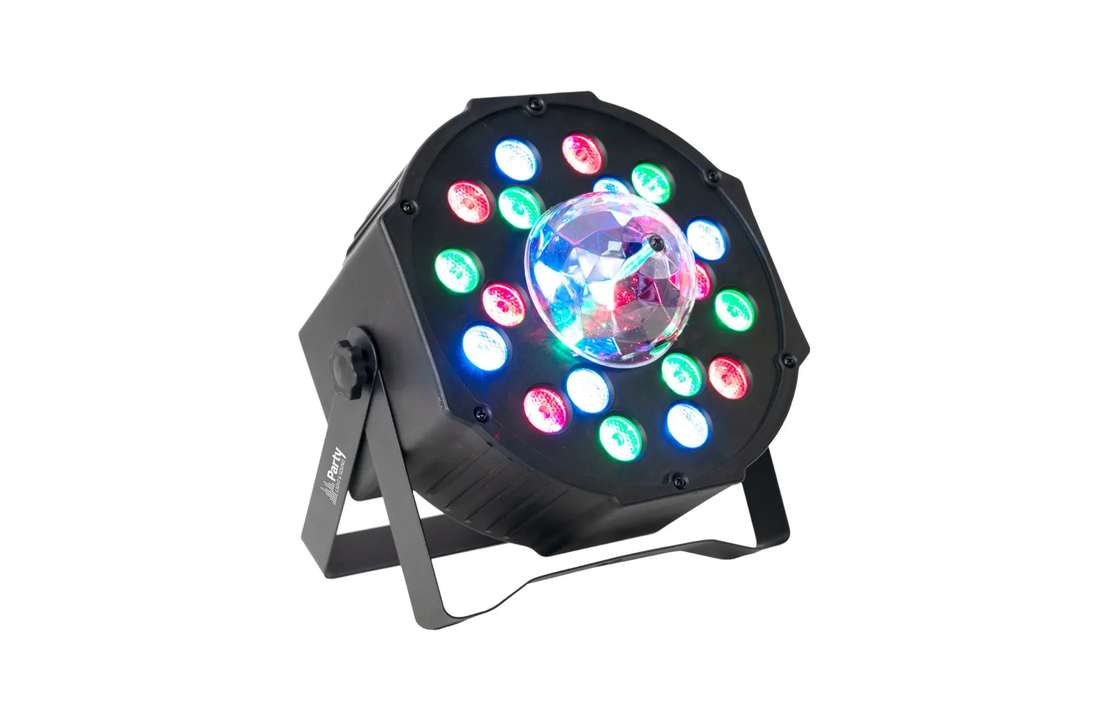 Party PAR-ASTRO, συνδυασμός φωτιστικού par με 18 RGB LEDs των 0.75W το καθένα και εφέ ASTRO με 3 RGB LEDs των 0.5W με λειτουργία DMX 7 καναλιών.