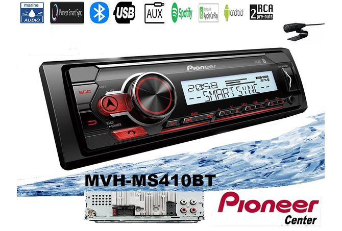 Με ένα σύμμορφο επικαλυμμένο PCB, μια οθόνη LED υψηλής ορατότητας, 2 x RCA pre-out, δέκτη AM/FM, Bluetooth και το πιο σημαντικό συμβατό με την εφαρμογή Pioneer Smart Sync, το MVH-MS410BT θα είναι μια ευπρόσδεκτη προσθήκη στα ταξίδια σας με σκάφος.