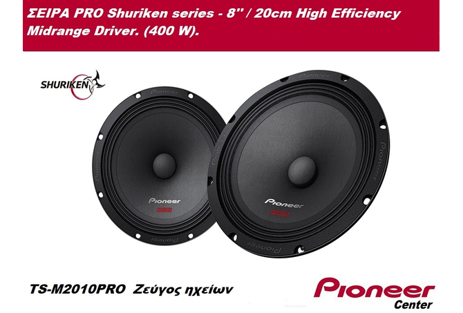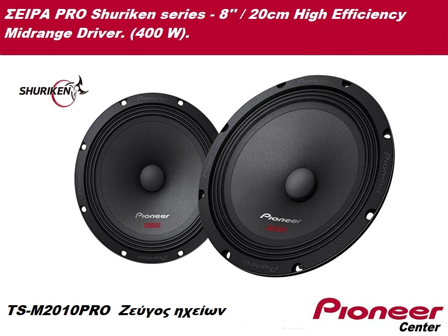 The Pioneer PRO Shuriken series TS-M2010PRO Midrange Driver is a 20cm high efficiency speaker featuring a thick steel woofer basket design with a light weight yet rigid pulp cone, a large ferrite magnet and power motor assembly, a Copper Clad Aluminium Wire (CCAW) and an OFC short ring to reduce distortion and expand the wide range of crisp, loud and clear frequencies.
