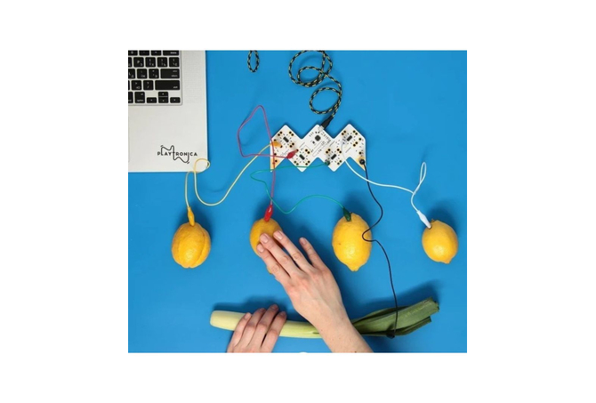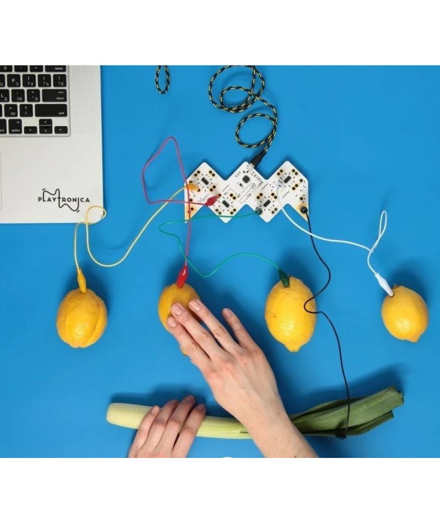 Χρησιμοποιήστε το περιεχόμενο της φρουτιέρας σας ως πληκτρολόγιο πιάνου με το Playtron!Συνδέστε έως και 16 αντικείμενα με τα κλιπς (κροκοδειλάκια), επιλέξτε διαφορετικό ήχο για το καθένα και διασκεδάστε!Έτοιμοι να ξεκινήσετε! Χρειάζεστε έναν υπολογιστή, tablet ή smartphone, μια συσκευή Playtron και έως και 16 αντικείμενα που μπορούν να μεταφέρουν ηλεκτρισμό.Απλώς ανοίξτε οποιοδήποτε online synth και είστε έτοιμοι να παίξετε! Χωρίς καθυστέρηση, το Playtron αντιδρά όπως κάθε άλλο MIDI controller.Τι μπορείτε να κάνετε- Παίξτε με φρούτα και λαχανικά όπως θα παίζατε με ένα πληκτρολόγιο πιάνου- Παίξτε μόνοι ή παρέα με έναν φίλο- Δεν χρειάζονται μουσικές δεξιότητεςΠώς θα το χρησιμοποιήσετε1. Συνδέστε το Playtron στον υπολογιστή, το tablet ή το smartphone σας χρησιμοποιώντας το παρεχόμενο καλώδιο USB.Σημείωση: Εάν δεν έχετε τυπική θύρα USB, μπορεί να χρειαστείτε έναν προσαρμογέα Lightning, Micro USB ή USB Type-C.2. Με το Playtron ήδη συνδεδεμένο στον υπολογιστή σας, χρησιμοποιήστε το Google Chrome για να ανοίξετε το synth.playtronica.com ή το play.playtronica.com και επιλέξτε όποιο synth σας αρέσει, για να πειραματιστείτε με τον ήχο!3. Συνδέστε το ένα άκρο του καλωδίου (κροκοδειλάκι) στο Playtron και το άλλο με το αντικείμενο (μπορείτε να συνδέσετε με τον ίδιο τρόπο έως και 16 αντικείμενα)4. Αγγίξτε τη σύνδεση γείωσης: μία από τις δύο κάτω γωνίες του Playtron σε άλλο αντικείμενο. Αυτό θα σας επιτρέψει να γειώσετε το Playtron σας, μια απαίτηση για να ξεκινήστε να παίζετε με τα αγώγιμα αντικείμενα!5. Με το ένα χέρι να αγγίζει το αντικείμενο που επιλέξατε ως γείωση, αγγίξτε οποιοδήποτε από τα αντικείμενα που συνδέονται με τις νότες.Πρόσθετες πληροφορίες- Το Playtron δεν είναι αδιάβροχο- Το Playtron είναι απολύτως ασφαλές, αλλά δεν συνιστούμε τη χρήση του σε άτομα με βηματοδότες (για κάθε περίπτωση)- Το Playtron μπορεί να χρησιμοποιηθεί μόνο με αγώγιμα αντικείμενα. Μάθετε περισσότερα για τα αγώγιμα αντικείμενα εδώΤο kit περιλαμβάνει - MIDI Playtron, καλώδιο USB, 18 κλιπς-κροκοδειλάκια, σακουλάκι αποθήκευσης, set αυτοκόλληταΠερισσότερα για τον τρόπο χρήσης του Playtron εδώ