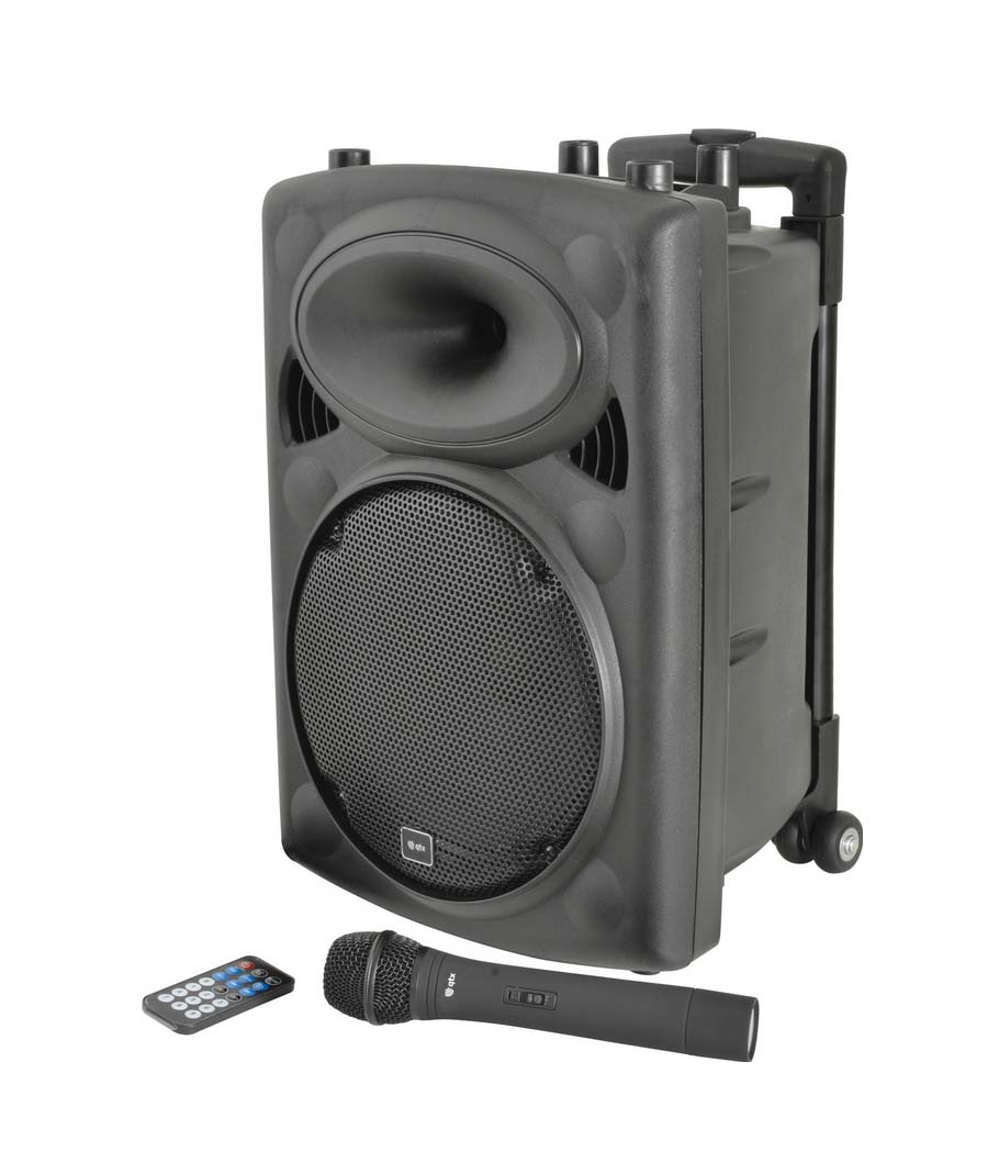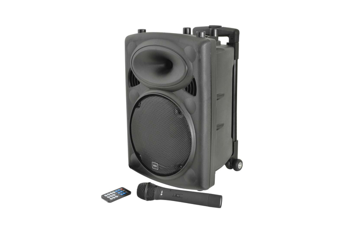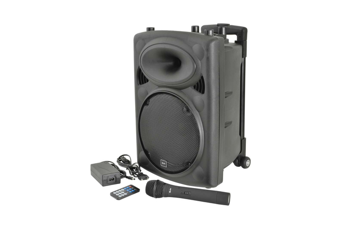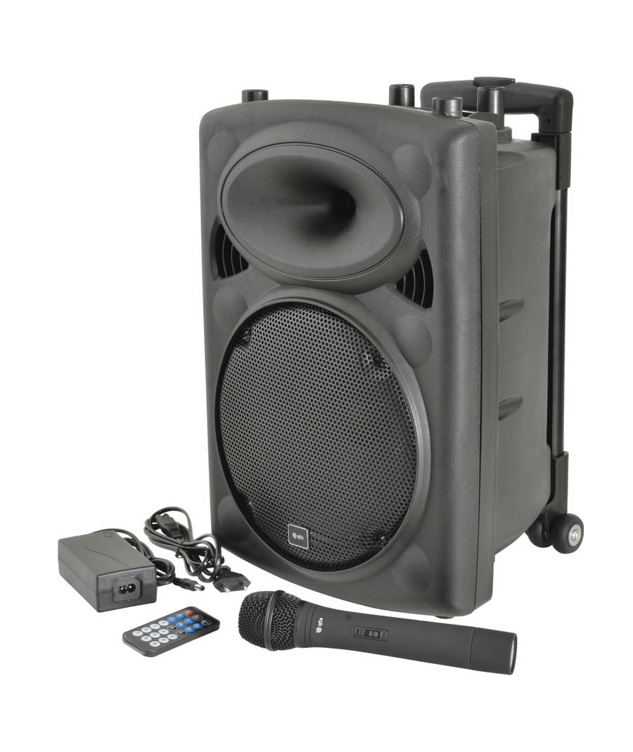Συμπτυγμένη φορητή μονάδα PA που βασίζεται στην καμπίνα ηχείων QR.Ενσωματωμένος ενισχυτής που λειτουργεί από το δίκτυο ή την εσωτερική επαναφορτιζόμενη μπαταρία που τροφοδοτεί έναν κύριο οδηγό και μια μονάδα κόρνας με κίνηση συμπίεσης.Περιλαμβάνονται δύο ασύρματα μικρόφωνα χειρός VHF (σε εκδόσεις 8" ή 10" ) με τον δέκτη ενσωματωμένο στο τμήμα του μίκτη/ενισχυτή στο πίσω μέρος μαζί με άλλες δύο ενσύρματες εισόδους μικροφώνου, είσοδο βοηθητικής γραμμής και ενσωματωμένα μέσα USB/SD/FMσυσκευή αναπαραγωγής με λειτουργία εγγραφής.Ένας δέκτης Bluetooth είναι επίσης ενσωματωμένος στη συσκευή αναπαραγωγής πολυμέσων για να επιτρέπει τη σύζευξη με smartphone ή tablet για ασύρματη αναπαραγωγή ήχου.Μια αναδιπλούμενη λαβή τρόλεϊ και οι πίσω τροχοί παρέχουν εύκολη μεταφορά.Περιλαμβάνεται μικρόφωνο χειρός VHFΕφέ echo για μικρόφωναΕνσωματωμένη συσκευή αναπαραγωγής USB/SD/FM με δυνατότητα εγγραφής και χειριστήριοΛειτουργία ρεύματος/επαναφορτιζόμενηΕνσωματωμένη εγκατάσταση τρόλεϊΛειτουργία «παράκαμψης μικροφώνου» με δυνατότητα εναλλαγής VCVΑσύρματη σύζευξη B/TΠροαιρετικά διαθέσιμα μικρόφωνα με ζώνη λαιμού VHF (178.891 UK & 178.892 UK)Χαρακτηριστικά: