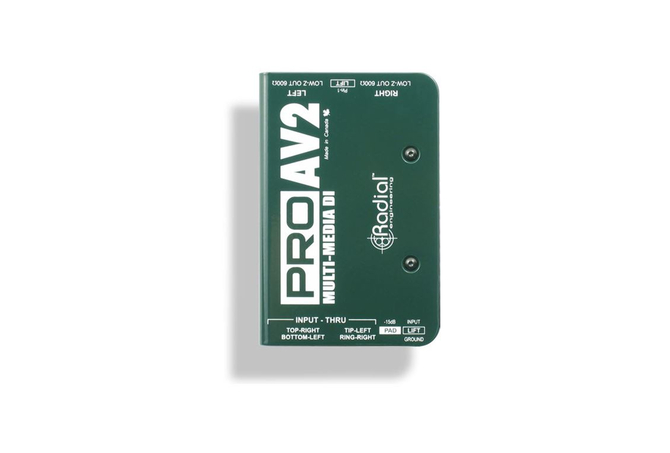 Το ProAV2 από τη Radial Engineering είναι ένα παθητικό direct box σχεδιασμένο για εφαρμογές πολυμέσων με γνώμονα τον integrator ήχου-εικόνας. Η μονάδα παρέχει πλήρη στερεοφωνική λειτουργικότητα δύο καναλιών και περιλαμβάνει υποδοχές 1/4" για όργανα και υποδοχές RCA και 3.5mm για ηλεκτρονικά είδη ευρείας κατανάλωσης και υπολογιστές.