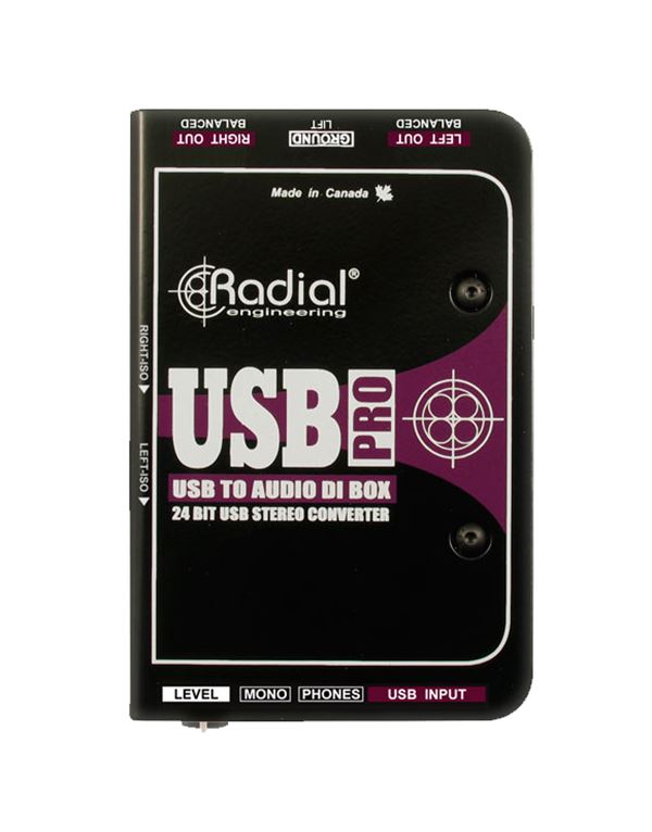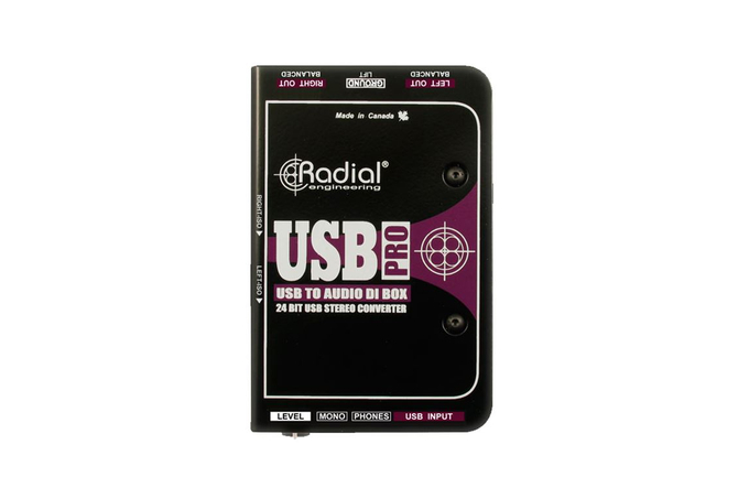 Radial USB-Pro είναι ένα υψηλής ανάλυσης στέρεο Di Box, σχεδιασμένο για μετατροπή αρχείων ήχου από φορητό υπολογιστή, καθώς και την απρόσκοπτη μεταφορά τους σε ζεύγος συμμετρικών εξόδων ήχου, για τροφοδότηση ΡΑ, ηχογράφηση ή για κονσόλα μείξης. Το