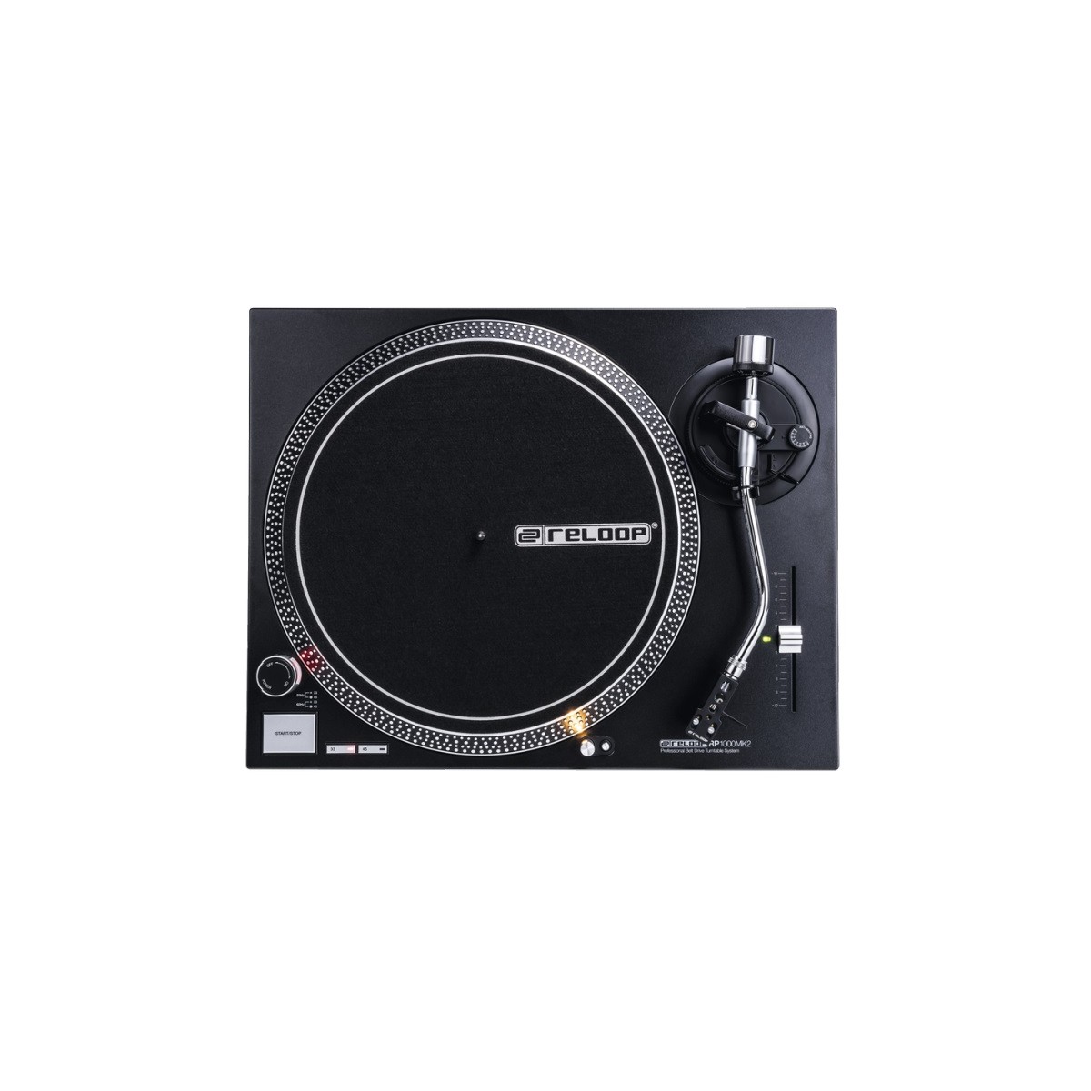 Reloop RP-1000 MK2 πικάπ με μοτέρ που λειτουργεί με ιμάντα (belt drive). Στη συσκευασία περιλαμβάνεται βελόνα Reloop OM Black (από Ortofon), κεφαλή, slipmat, αντίβαρο, καλώδιο τροφοδοσίαςΤο RP-1000 MK2 αποτελεί την ιδανική πρόταση τόσο για τον ανερχόμενο DJ όσο και για τον λάτρη του HiFi. Η νέα του κατασκευή περιλαμβάνει ανανεωμένη σχεδίαση και νέα μεταλλικά κουμπιά άμεσης απόκρισης με μοναδική αίσθηση.Το πλατό είναι ακριβείας, κατασκευασμένο από χυτό μέταλλο το οποίο κινείται από ελαστικό ιμάντα υψηλής ποιότητας ο οποίος απορροφά και μειώνει τους ανεπιθύμητους κραδασμούς για αναπαραγωγή με μειωμένες παραμορφώσεις. Ο βραχίονας του RP-1000 MK2 είναι σχήματος S με υδραυλική ανύψωση και μηχανισμό anti-skating, διατηρώντας εξαιρετική σταθερότητα κατά την αναπαραγωγή δίσκων. Διαθέτει κατευθυντικό LED φωτισμός για την παρακολούθηση της βελόνας που αναπτύσσεται με το πάτημα ενός κουμπιού, μεταλλικά κουμπιά και αντικραδασμικά ποδαράκια στήριξης. Τεχνικά ΧαρακτηριστικάΠικαπ:Τύπος: belt drive turntableDrive: belt driveMotor: DC motorTurntable speeds: 2 speeds, manual (33 1/3, 45 RPM)Brake time: < 1 sec.Start-up / rpm change: < 1 sec.Wow and flutter: < 0.25% WRMSSignal-to-noise ratio: > 50 dB (DIN-B)Brake system: electronic brakeRecord weight: recommended 350gΠλατό:Υλικό: aluminium die-castΔιάμετρος: 332 mmΒραχίονας:Τύπος: universal, statically balanced, s-shapedEffective length: 230.5 mmOverhang: 16 mmTracking angle error: < 3°Applicable pick-up weight: 3.5 – 8.5 g (incl. headshell 13 – 18 g)Anti-skating range: 0 - 7 gΣυνδέσεις:1x Phono out (gold-plated)Γενικά:Τροφοδοσία: AC 115/230 V, 60/50 Hz (US/EU)Κατανάλωση: 10 WΔιαστάσεις: 450 x 144 x 352 mmΒάρος: appr. 5.7 kg