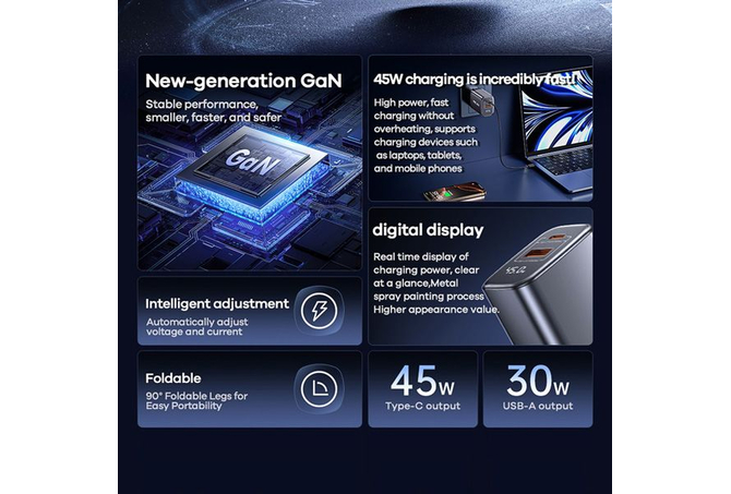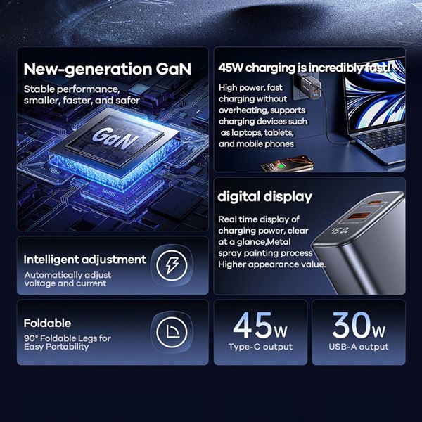 Compact size with high power output, utilizing Gallium Nitride technology for safe and efficient charging without damaging devices.