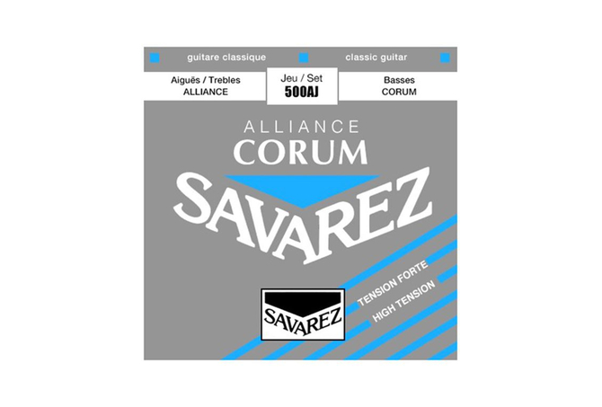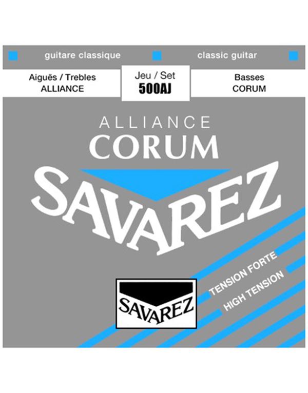 Αυτό το σετ χορδών νάιλον κιθάρας Savarez Corum Alliance 500AJ Blue High Tension περιλαμβάνει Corum polished ασημένια μπάσα με πρίμα KF Alliance.
