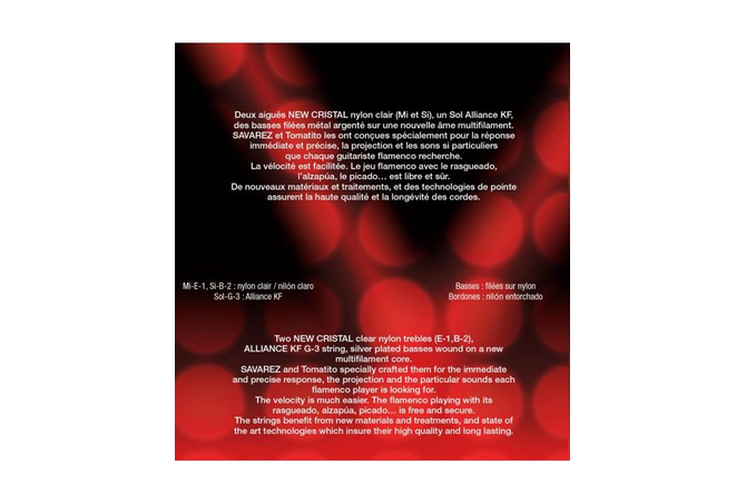 Οι χορδές κλασικης/ flamenco κιθάρας Tomatito της Savarez S.A. φέρνουν νέες τεχνολογίες και τεχνικές κατασκευής χορδών στην κιθάρα flamenco. Συνδυάζοντας Alliance KF Σολ Χορδη της Savarez με Cristal clear νάιλον Σι και Μι και μπάσες χορδές με πολλαπλούς πυρήνες, το σετ Tomatito σας παρέχει την ακριβή απόκριση και την εκτεταμένη προβολή που χρειάζεστε στο flamenco.