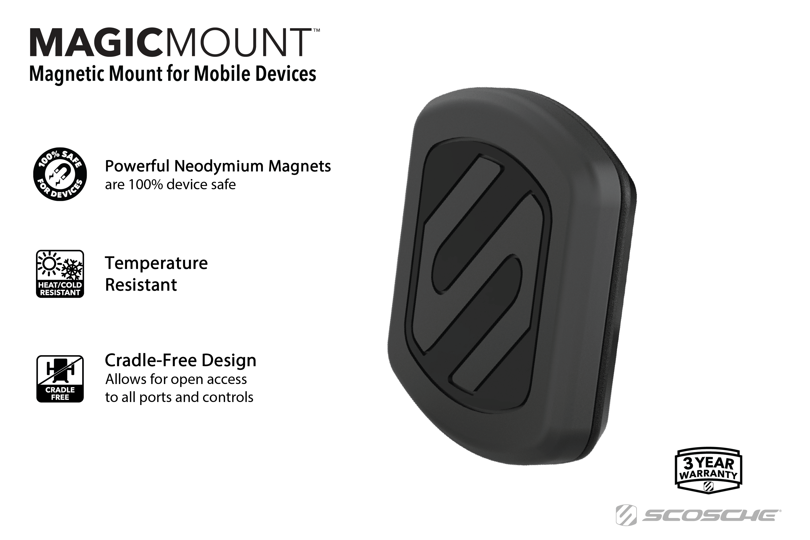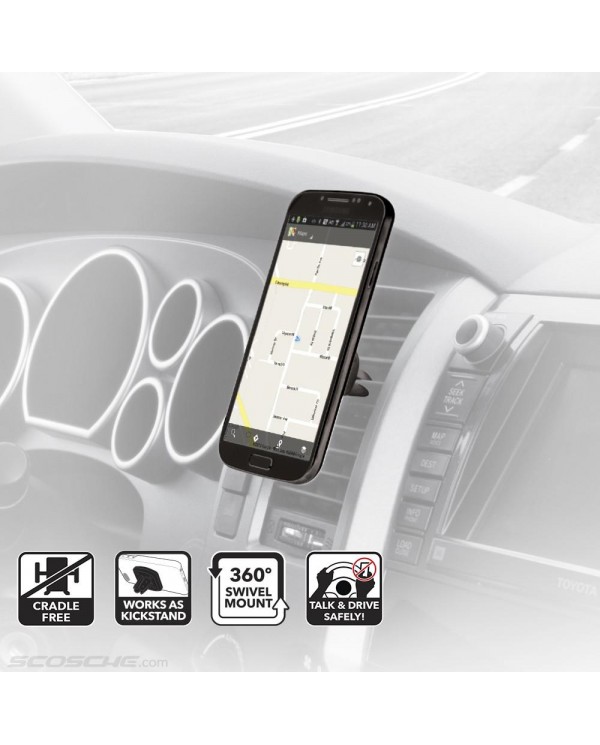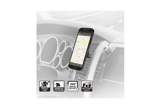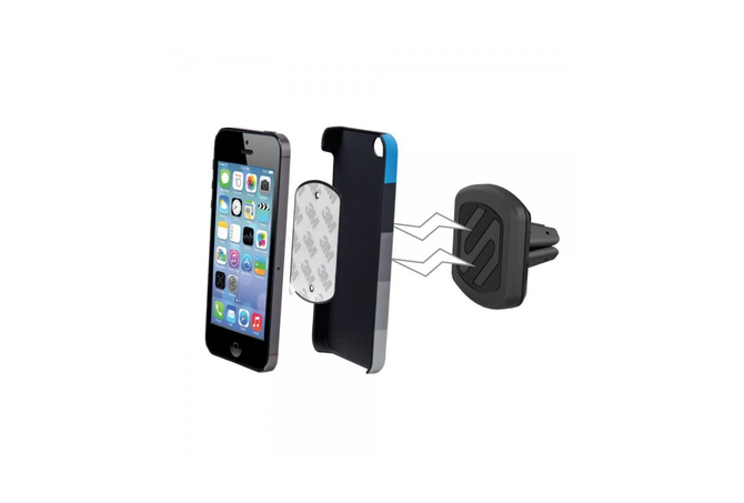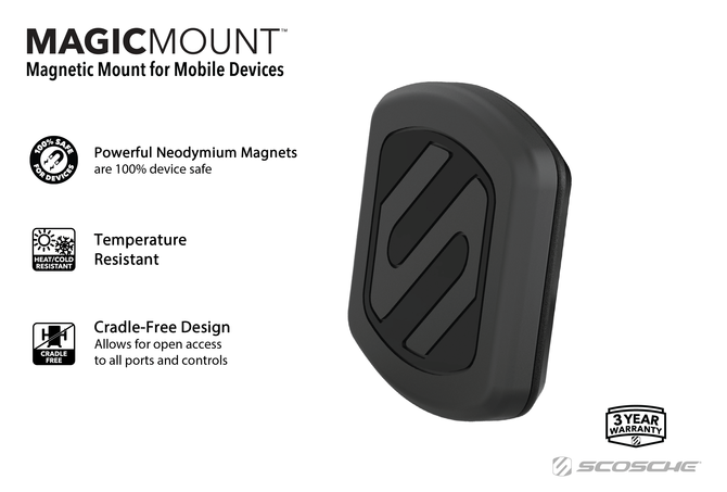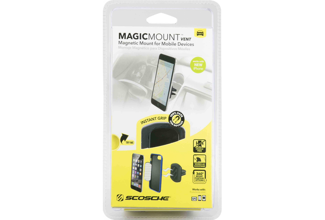 Η πολυβραβευμένη μαγνητική βάση MagicMount της Scosche αποτελεί την απλούστερη και σταθερότερη βάση στήριξης για κινητά, tablet, κ.α. Απλά τοποθετείστε την συσκευή σας πάνω στην μαγνητική βάση και αυτή θα κλειδώσει με ασφάλεια στην θέση της. Είναι καλαίσθητη ενώ ρυθμίζεται πανεύκολα. Διαθέτει ισχυρούς μαγνήτες νεοδυμίου για σταθερή συγκράτηση της συσκευής κάθετα ή οριζόντια για βέλτιστη γωνία θέασης!ΤοποθέτησηΤοποθετήστε την βάση MagicMount Vent στους αεραγωγούς του αυτοκινήτου σας.Δυνατοί τρόποι τοποθέτησης του MagicPlateΤο μαγνητικό σύστημα MagicMount χρησιμοποιεί ισχυρούς μαγνήτες για ασφαλή συγκράτηση της MagicPlate η οποία είναι μία μικρή μεταλλική πλάκα που εύκολα τοποθετείται στο πίσω μέρος της συσκευής σας. Μπορείτε με την κολλητική ταινία που διαθέτει να την τοποθετήσετε: