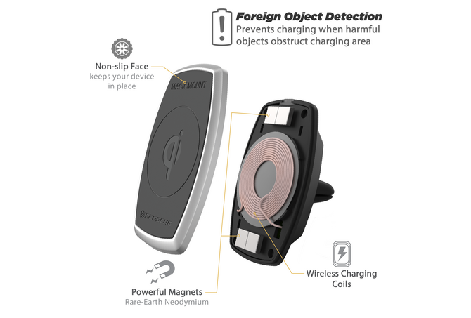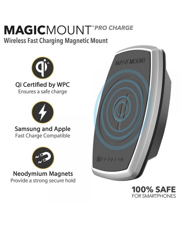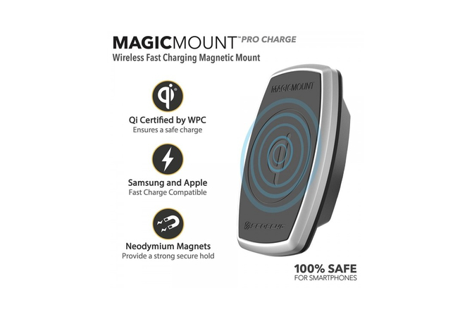 Η λειτουργία ασύρματης φόρτισης βρίσκει το δρόμο της σε εκατομμύρια συσκευές. Η ασύρματη φόρτιση χρησιμοποιεί ηλεκτρομαγνητικά πεδία για την ασφαλή μεταφορά ενέργειας από μια πηγή μετάδοσης (στην περίπτωση αυτή τη μονάδα φόρτισης MagicMount) σε μια συσκευή λήψης (ενσωματωμένη σε smartphone με δυνατότητα Qi ή διαθέσιμη ως πρόσθετο μέσω καλυμμάτων μπαταριών, δεκτών και άλλων) σκοπό της ασύρματης φόρτισης της μπαταρίας της συσκευής.Η Scosche έχει συνδυάσει την τελευταία τεχνολογία ασύρματης φόρτισης Qi με το # 1 Mount Brand στις Η.Π.Α. για την απόλυτη λύση στη μαγνητική τοποθέτηση χωρίς χέρια και την ασύρματη φόρτιση.Αυτό το ασύρματο στήριγμα μαγνητικής φόρτισης παρέχει μέχρι και 10W ισχύ φόρτισης, δύο φορές την ισχύ φόρτισης των περισσότερων προϊόντων ασύρματης φόρτισης, έτσι ώστε οι συσκευές με δυνατότητα Qi να φορτίζονται γρήγορα.