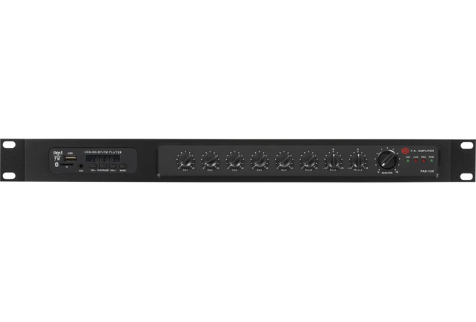 Show PAX-120 ολοκληρωμένος ενισχυτής Class D ισχύος 120W / 100V. Στην μπροστινή όψη βρίσκονται, μία θύρα USB και SD card reader για αναπαραγωγή μουσικών αρχείων. Διαθέτει Bluetooth για ασύρματη σύνδεση με συσκευές ήχου και δέκτη FM. Στην πίσω πλευρά υπάρχουν 4 είσοδοι μικροφώνου (XLR) με επιλογή ανάμεσα σε mic / line με προτεραιότητα στην πρώτη είσοδο για αναγγελίες έκτακτης ανάγκης και μία AUX (RCA). Ο PAX-120 είναι ιδανικός για συστήματα αναγγελιών και background μουσικής σε χώρους όπως εμπορικά καταστήματα, bar, εστιατόρια κ.α. Μέγεθος Rack 1U. Διαστάσεις (MxBxY) 483 x 281 x 44mm – 4,9 κιλά