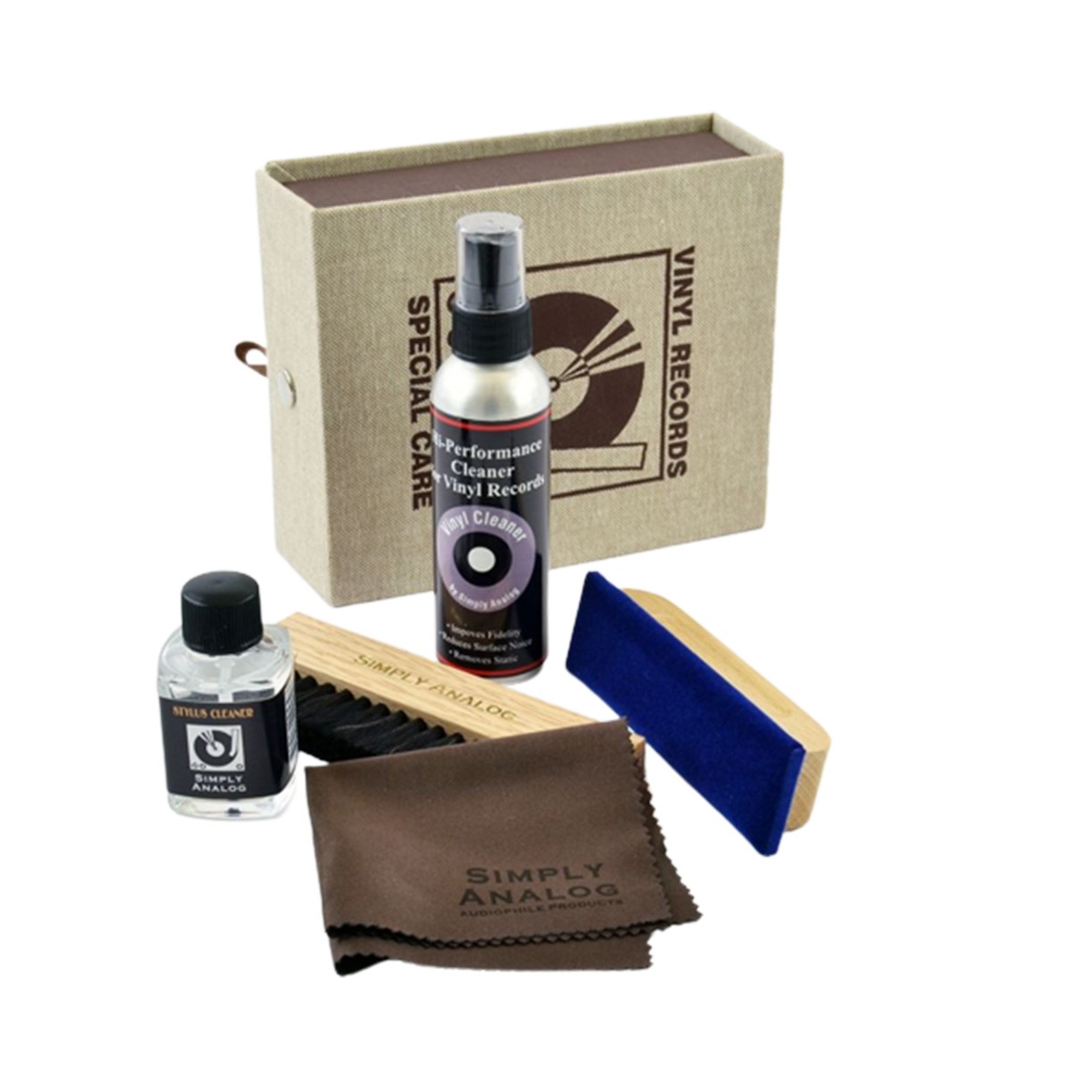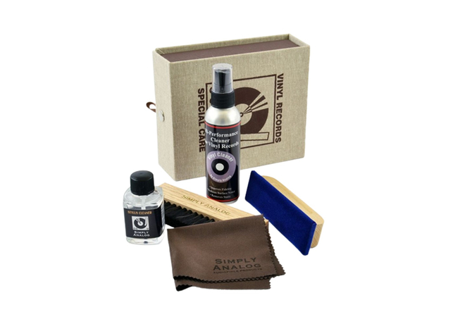 Simply Analog Deluxe Cleaning Boxset σε καφέ χρώμα, ολοκληρωμένο σύστημα καθαρισμού δίσκων που περιλαμβάνει ξυλινο βουρτσάκι με φυσική τρίχα από κατσίκα, βουρτσα από ξύλο βελανιδιάς με βελούδινο ύφασμα, υγρό για το καθαρισμό της βελόνας 30ml, υγρό καθαριστικό σε σπρέι για δίσκους 80ml και υψηλής ποιότητας ύφασμα με μικροίνες.