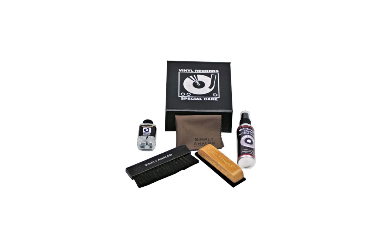 Simply Analog Deluxe Cleaning Boxset σe μαύρη δερμάτινη συσκευασία, ολοκληρωμένο σύστημα καθαρισμού δίσκων που περιλαμβάνει ξυλινο βουρτσάκι με φυσική τρίχα από κατσίκα, βουρτσα από ξύλο βελανιδιάς με βελούδινο ύφασμα, υγρό για το καθαρισμό της βελόνας 30ml, υγρό καθαριστικό σε σπρέι για δίσκους 80ml και υψηλής ποιότητας ύφασμα με μικροίνες.