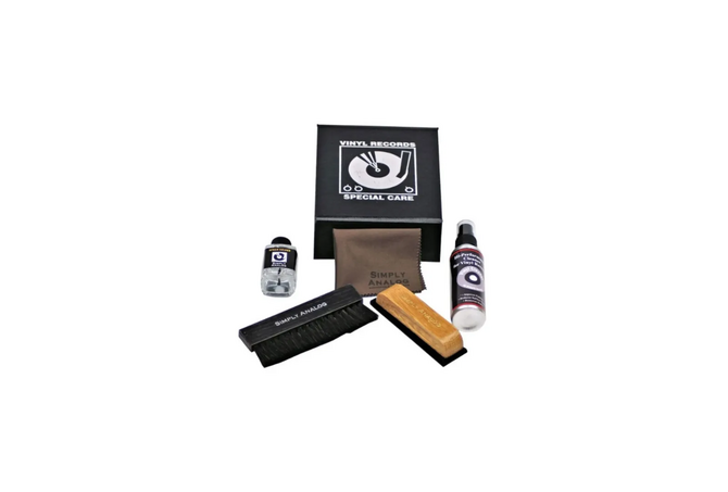Simply Analog Deluxe Cleaning Boxset μαύρη δερμάτινη συσκευασία, ολοκληρωμένο σύστημα καθαρισμού δίσκων που περιλαμβάνει ξυλινο βουρτσάκι με φυσική τρίχα από κατσίκα, βουρτσα από ξύλο βελανιδιάς με βελούδινο ύφασμα, υγρό για το καθαρισμό της βελόνας 30ml, υγρό καθαριστικό σε σπρέι για δίσκους 80ml και υψηλής ποιότητας ύφασμα με μικροίνες.