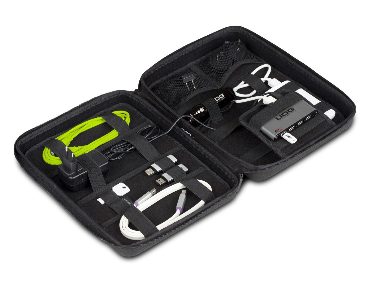 Σκληρή θήκη, ειδικά σχεδιασμένη για την αποθήκευση 2x εξωτ. Σκληρών Δίσκων, USB stick, καρτών SD, καλωδίων, τροφοδοτικών, φακού κ.α. Η UDG Creator DIGI Hard Case Large περιλαμβάνει 1x Ultra Slim Aluminium 7-Port USB 2.0 Hub και 1 τροφοδοτικό 5V/2A .