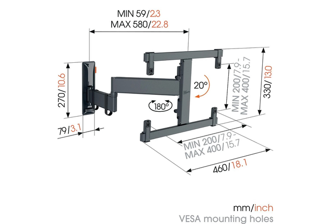 Hole pattern (VESA): 200 mm x 200 mm, 200 mm x 300 mm, 300 mm x 200 mm, 300 mm x 300 mm, 400 mm x 200 mm, 400 mm x 300 mm, 400 mm x 400 mm