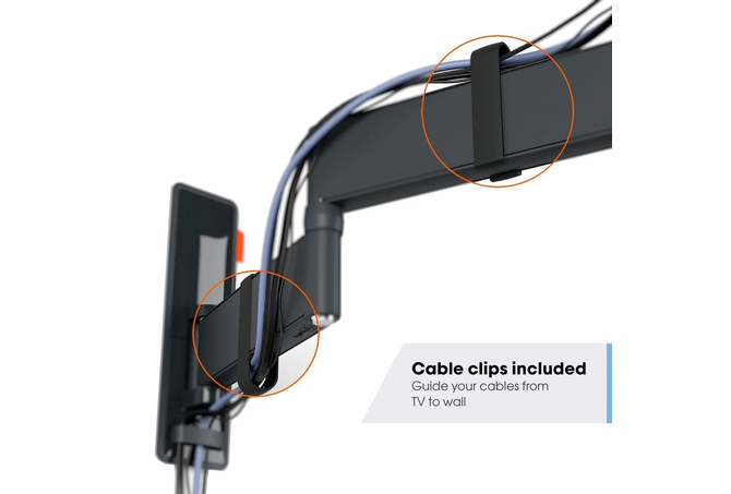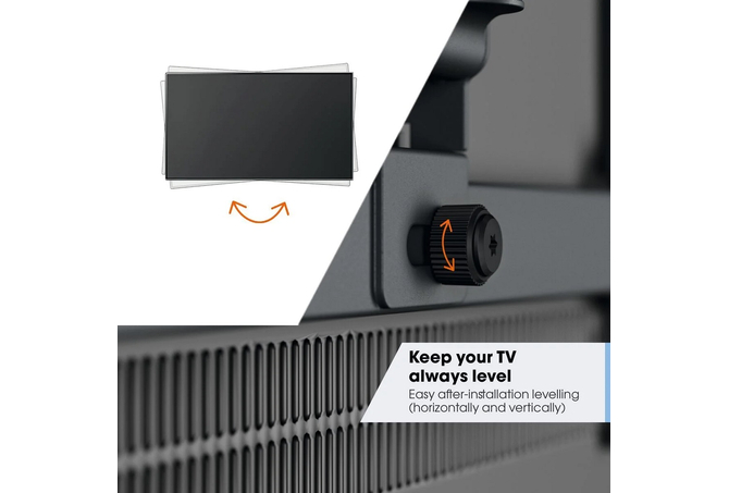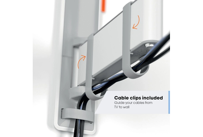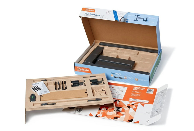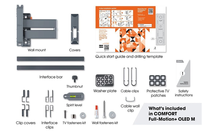 What's in the box: Wall mount, Cable clips, Wall mounting kit with fischer® Duo Power plugs, TV fasteners kit, Protective TV patches, Spirit level, Quick Installation Guide, DrillRight™ AR app, Drilling template