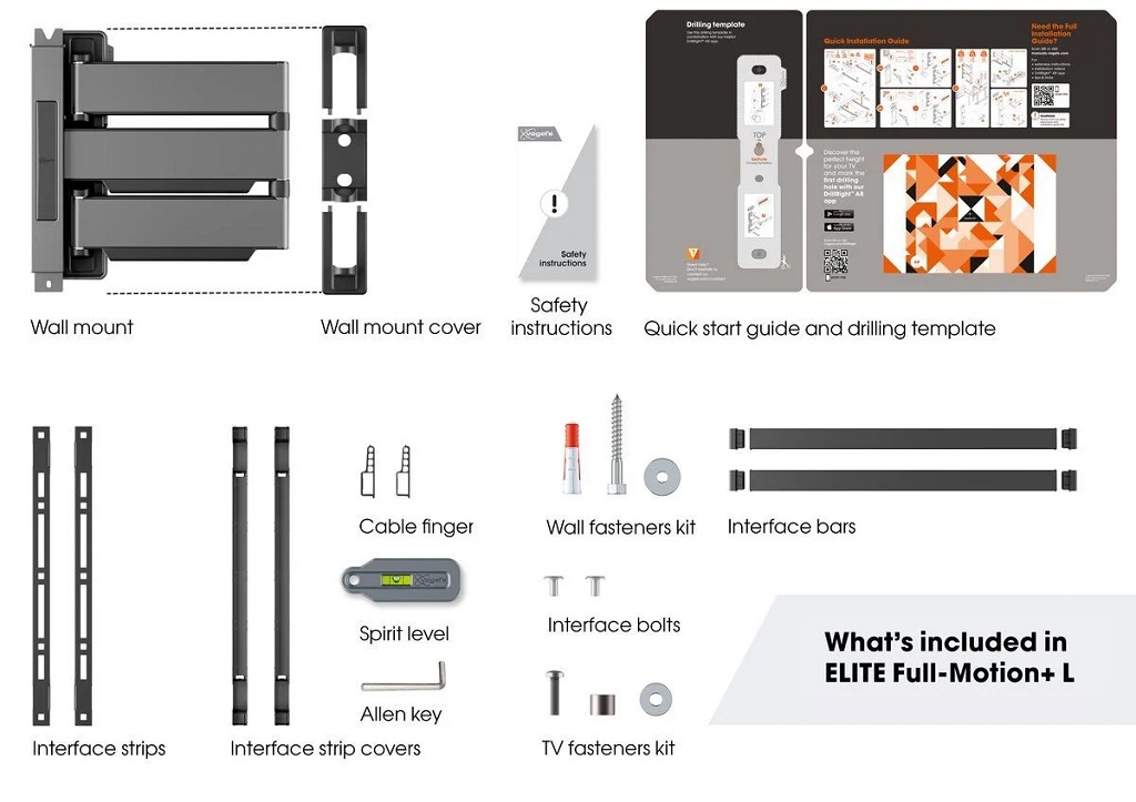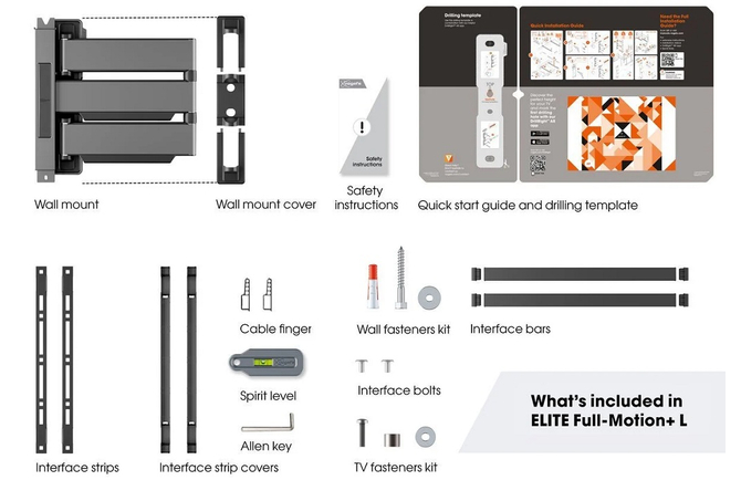 What's in the box: Wall mount, Wall mounting kit with fischer® Duo Power plugs, TV fasteners kit, Spirit level, Quick Installation Guide, DrillRight™ AR app, Drilling template