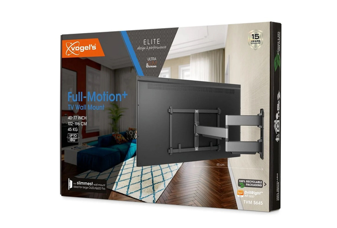 Η επιτοίχια βάση στήριξης τηλεόρασης ELITE Full-Motion+ είναι εύκολη στην εγκατάσταση. Συνοδεύεται από έναν οδηγό γρήγορης εγκατάστασης, ο οποίος εξηγεί τα πάντα με σαφήνεια. Θα βρείτε ακόμη περισσότερη βοήθεια στο διαδίκτυο, συμπεριλαμβανομένου ενός λεπτομερούς εγχειριδίου και του βίντεο εγκατάστασης. Περιλαμβάνονται ένα αλφάδι, ένα πρότυπο διάτρησης, βίδες και βύσματα fischer® DuoPower. Με τη δωρεάν εφαρμογή DrillRight™ AR, μπορείτε εύκολα να σημειώσετε την πρώτη τρύπα διάτρησης. Για την προστασία της πίσω πλευράς της τηλεόρασής σας κατά τη διάρκεια της τοποθέτησης, περιλαμβάνονται μαλακά μπαλώματα επιτοίχιας στήριξης.