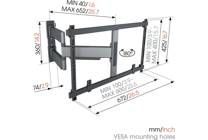 Hole pattern (VESA): 100 mm x 100 mm, 100 mm x 200 mm, 200 mm x 100 mm, 200 mm x 200 mm, 200 mm x 300 mm, 300 mm x 200 mm, 300 mm x 300 mm, 400 mm x 200 mm, 400 mm x 300 mm, 400 mm x 400 mm, 500 mm x 200 mm, 500 mm x 300 mm, 500 mm x 400 mm, 600 mm x 200 mm, 600 mm x 300 mm, 600 mm x 400 mm