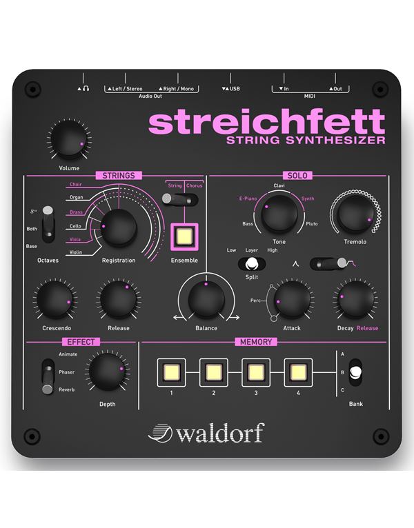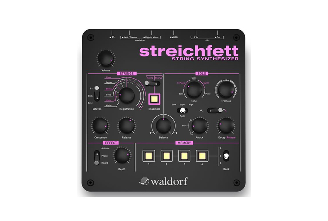 String hardware synth με πολυφωνικούς ήχους εγχόρδων, dual sound engine, solo section οκτώ φωνών, 128 νότες πολυφωνία, continuos morphing για βιολί/βιόλα/τσέλλο/πνευστά/όργανο/χορωδία, ensemble effect, layer/split για το solo section,phaser, reverb, 12 προγραμματιζόμενα patches, stereo output, έξοδος ακουστικών, USB, Midi in/out,